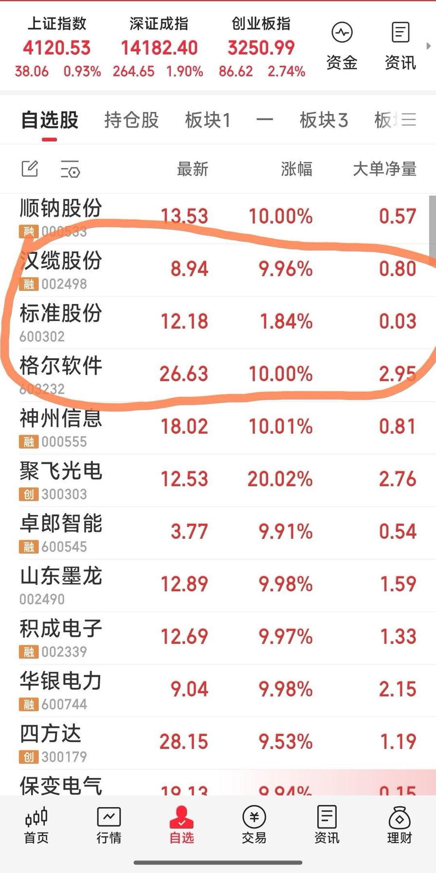 现抓的三牛:汉缆股份,标准股份,格尔软件。