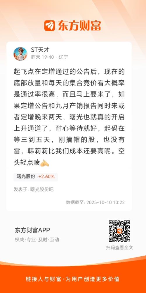 起飞点在定增通过的公告后,现在的底部放量和每天的集合竞价看大概率是通过率很高,而且马上要来了,如果定增公告和九月产销报告同时来或者定增晚来两天,曙光也就真的开启上升通道了,耐心等待就好,起码在等三到五天,刚摘帽的股,也没有雷,韩莉莉比我们成本还要高呢。空头轻点喷