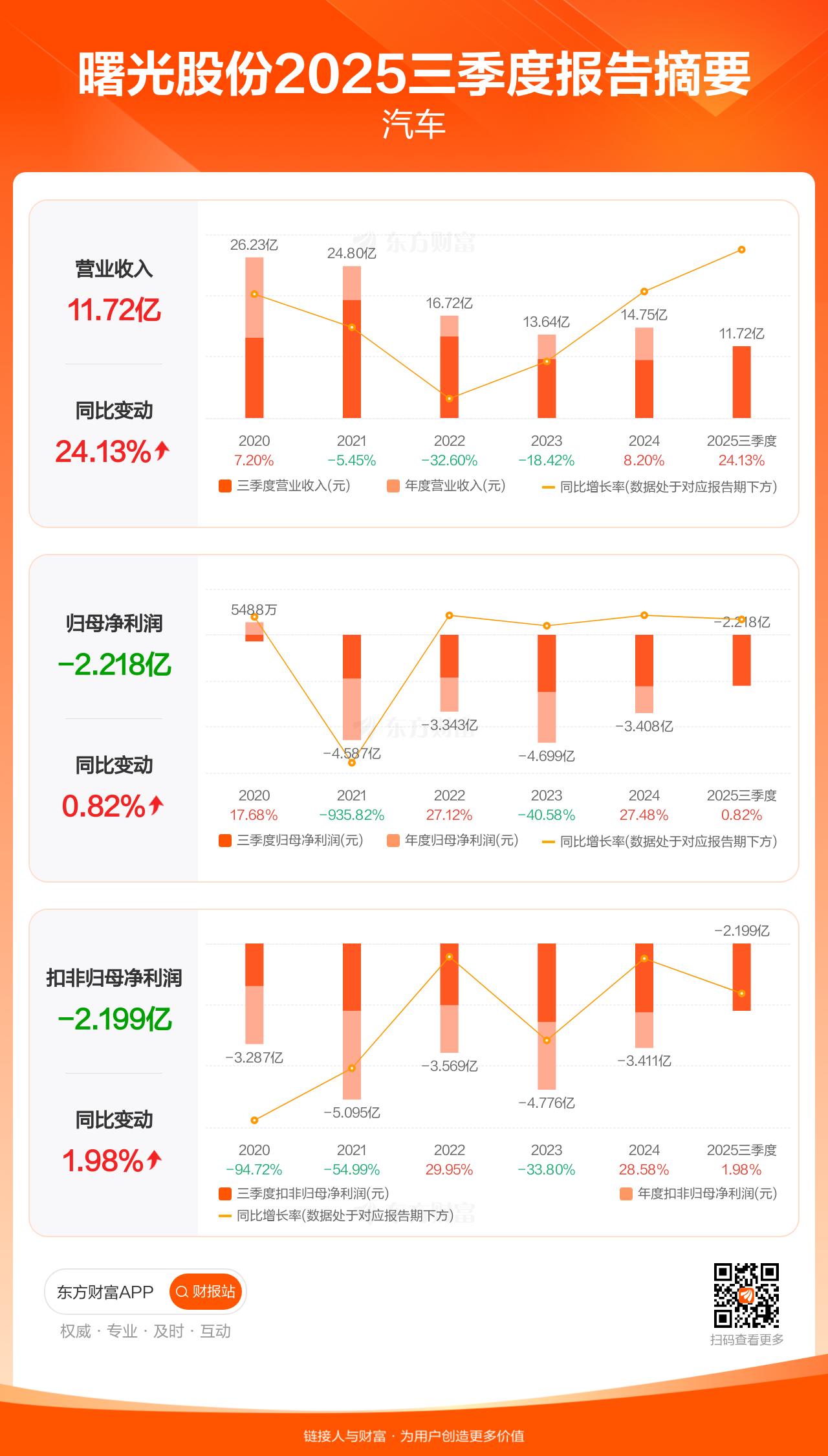 曙光股份10月31日发布2025年三季报显示,公司前三季实现营业收入11.72亿元,同比增长24.13%;归母净利润-2.22亿元;扣非归母净利润-2.20亿元。
