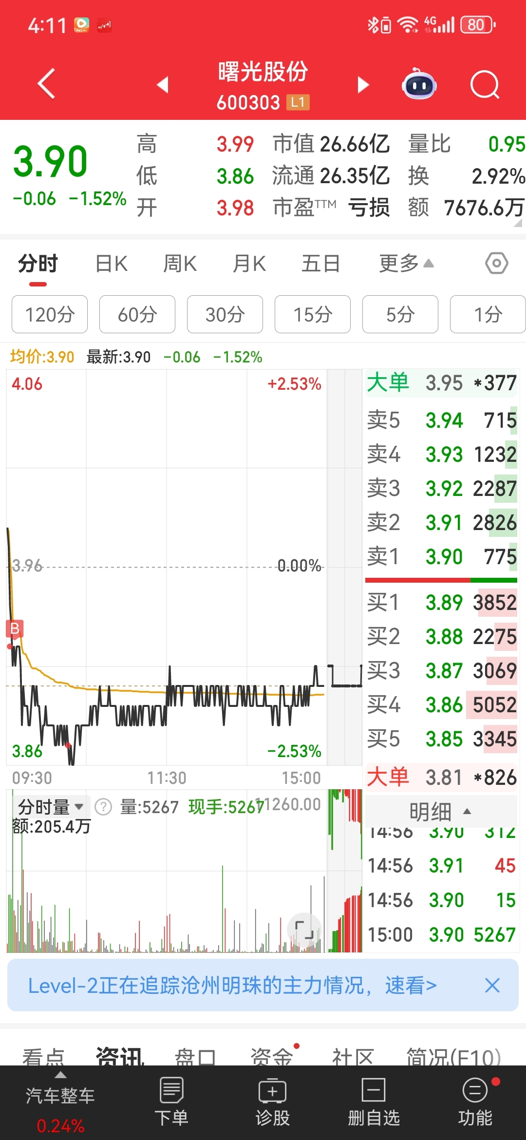 $曙光股份(SH600303)$ 买了一点点回来看看,到4就走,跌破3.85就跑。永远别再想套住我,设置好条件单!