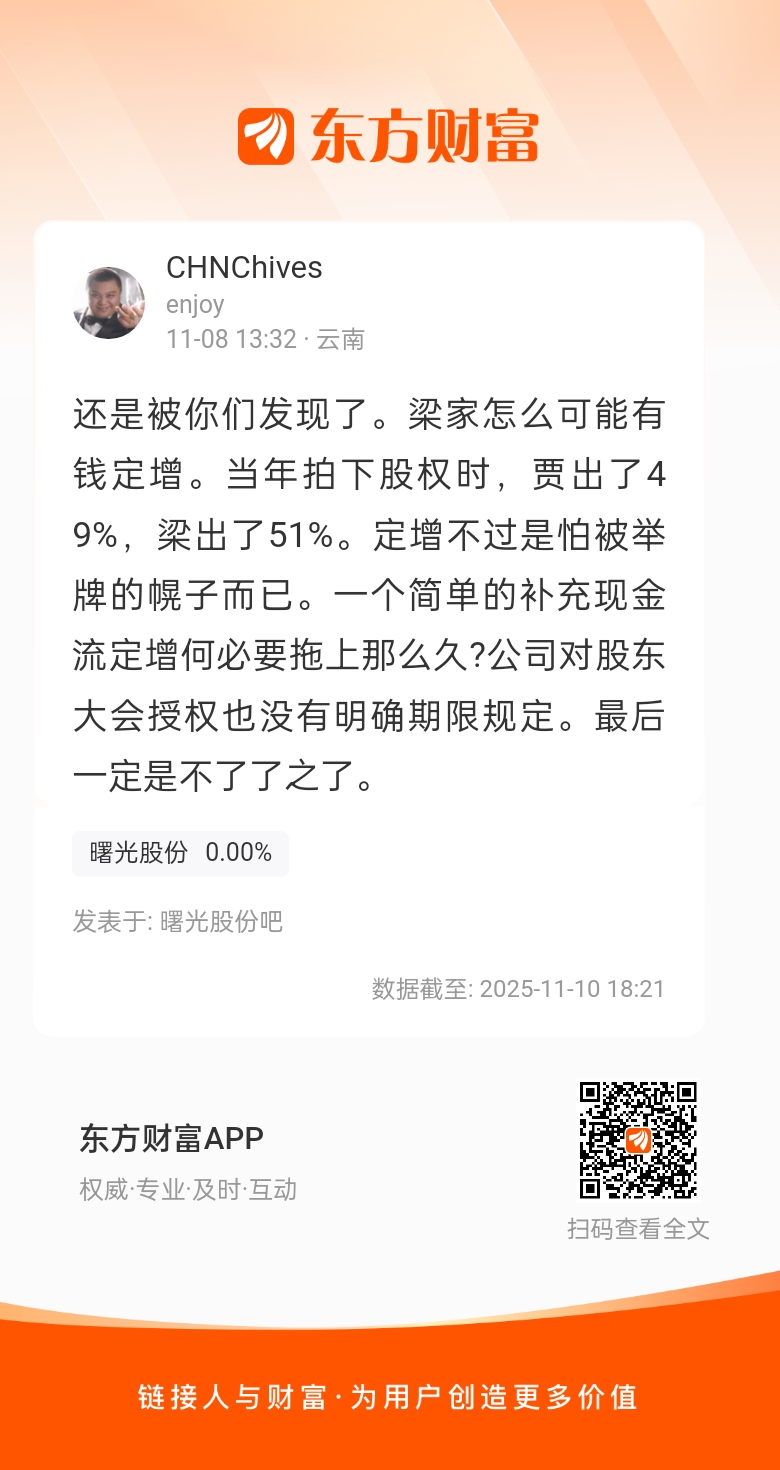还是被你们发现了。梁家怎么可能有钱定增。当年拍下股权时,贾出了49%,梁出了51%。定增不过是怕被举牌的幌子而已。一个简单的补充现金流定增何必要拖上那么久?公司对股东大会授权也没有明确期限规定。最后一定是不了了之了。