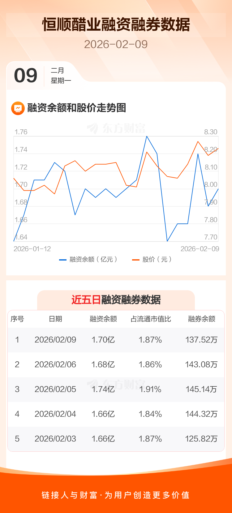 交易所最新数据显示,恒顺醋业于2026年2月9日获融资买入2090.53万元,融资偿还1945.40万元,当日融资净买入145.13万元。目前,该股融资余额1.70亿,占流通市值比例为1.87%。