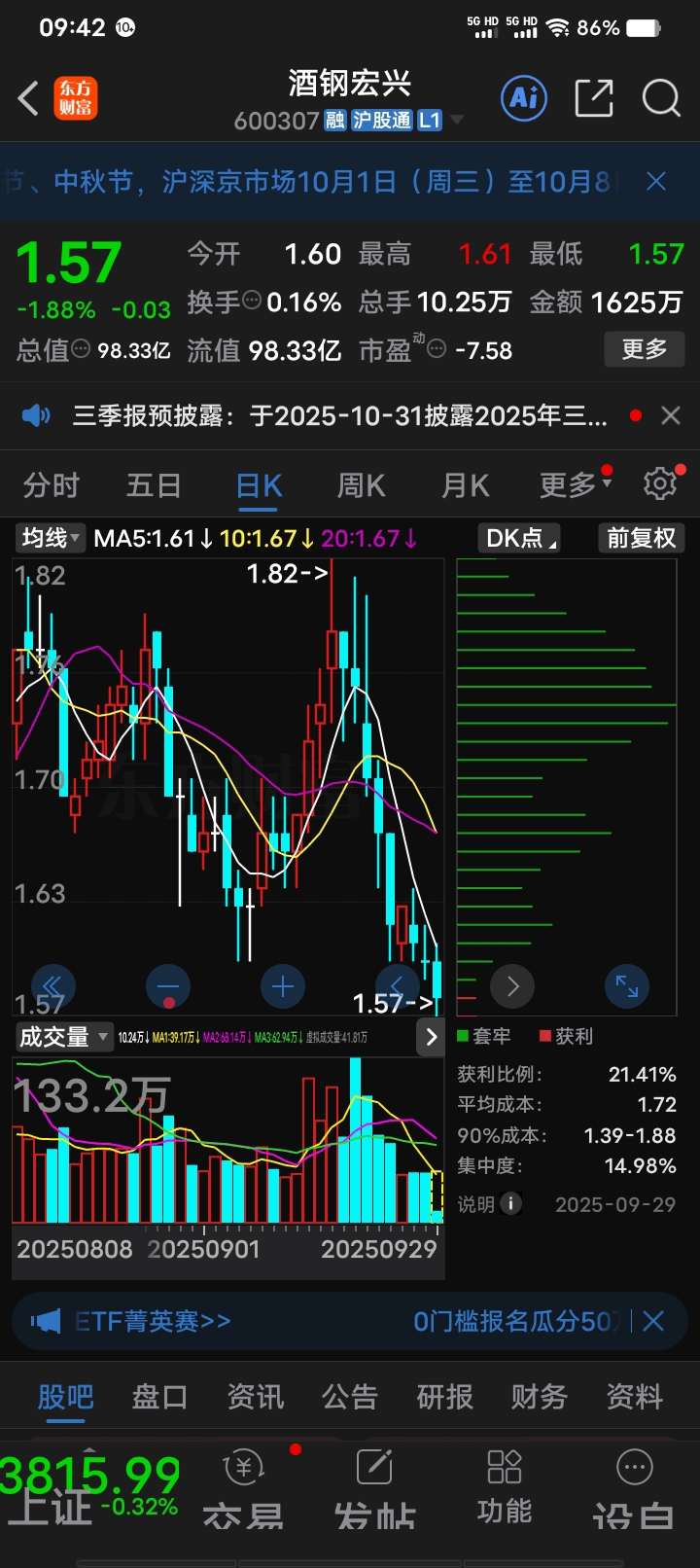 $酒钢宏兴(SH600307)$ 断涯式下跌。无底洞啊,连年亏损退市的节奏啊