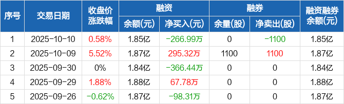 融资方面,当日融资买入556.04万元,融资偿还823.02万元,融资净偿还266.99万元。融券方面,融券卖出0股,融券偿还1100股,融券余量0股,融券余额0元。融资融券余额合计1.85亿元。