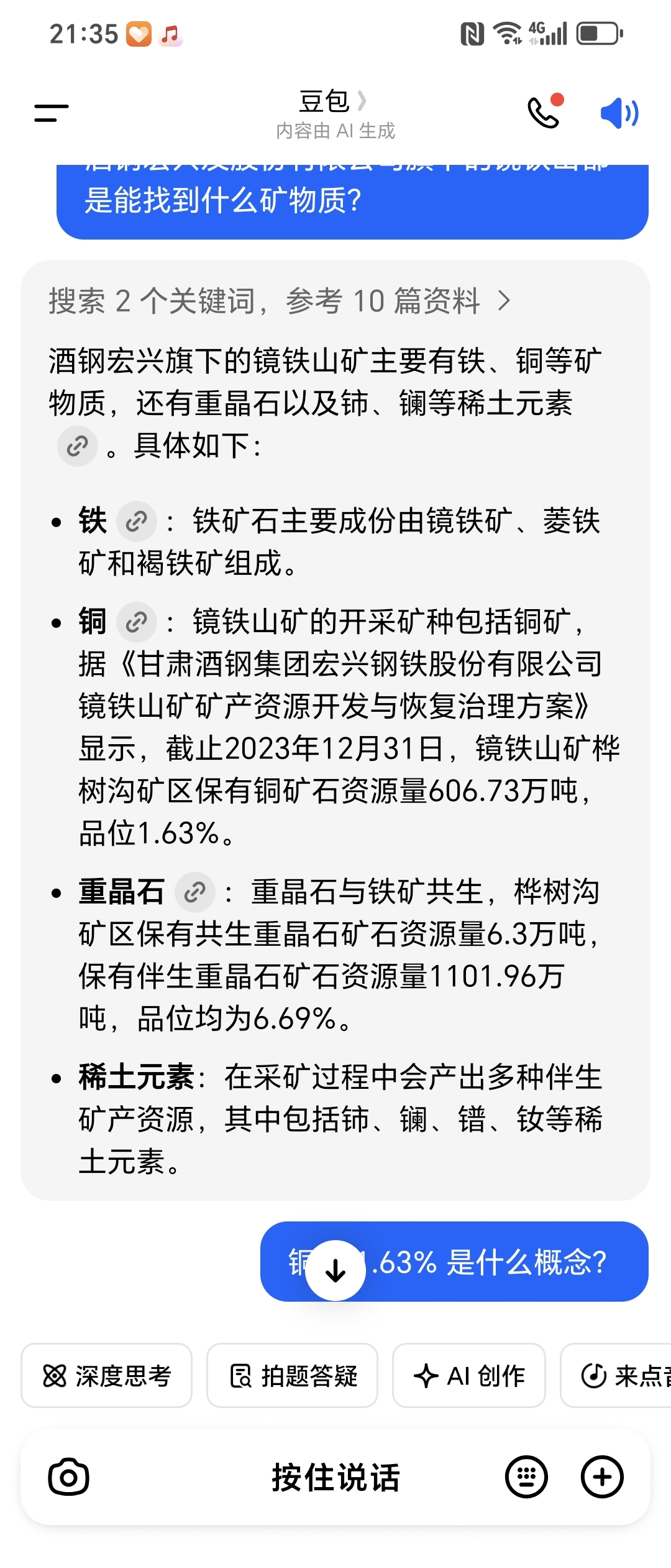 含量1.63%(高含量)的铜矿石,生产一顿铜大约60至80吨铜矿石,酒钢宏兴有约
