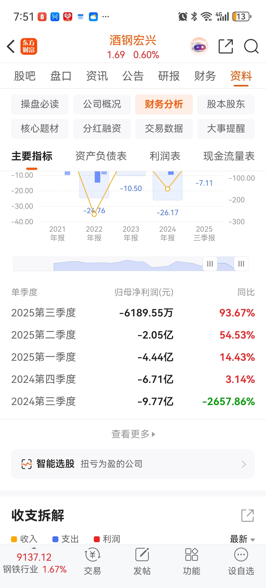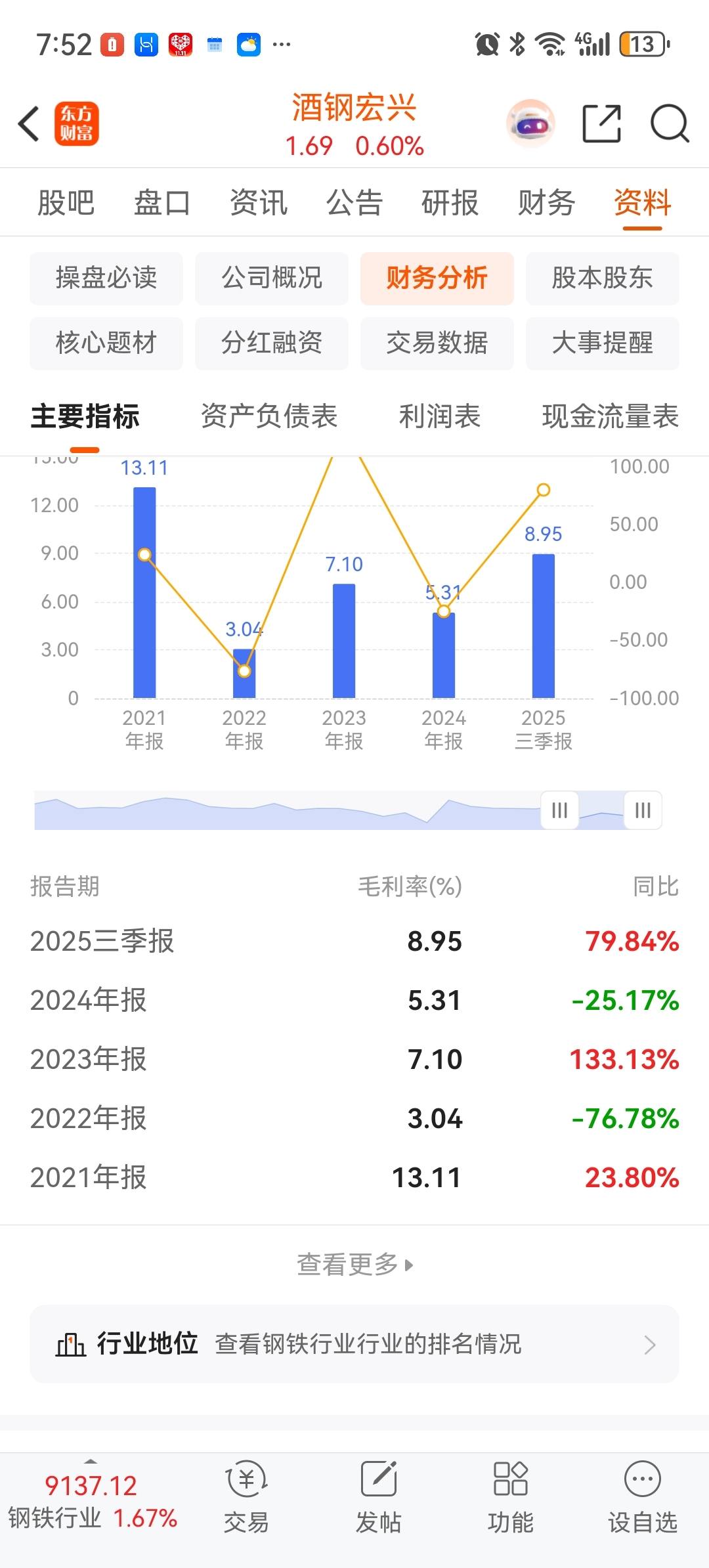 所以酒钢第三季度亏个6000万就是行为毛利率在上升让他开始慢慢好转,公司还的继续加油,当然也得看市场供应能不能帮助整体行业带动毛利率的上升。