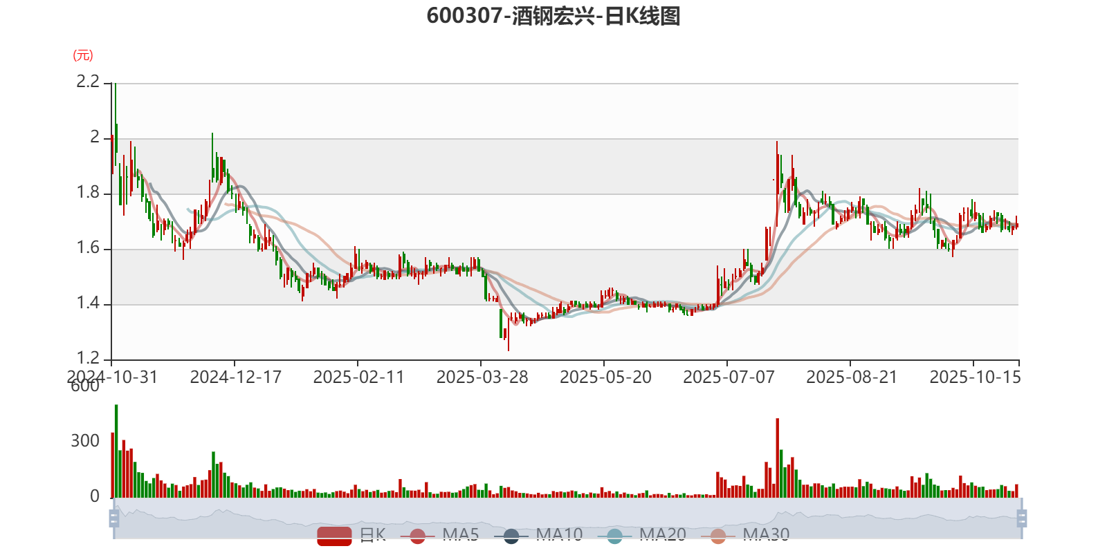 以10月30日收盘价计算,酒钢宏兴目前市盈率(TTM)约为-7.66倍,市净率(LF)约1.55倍,市销率(TTM)约0.32倍。