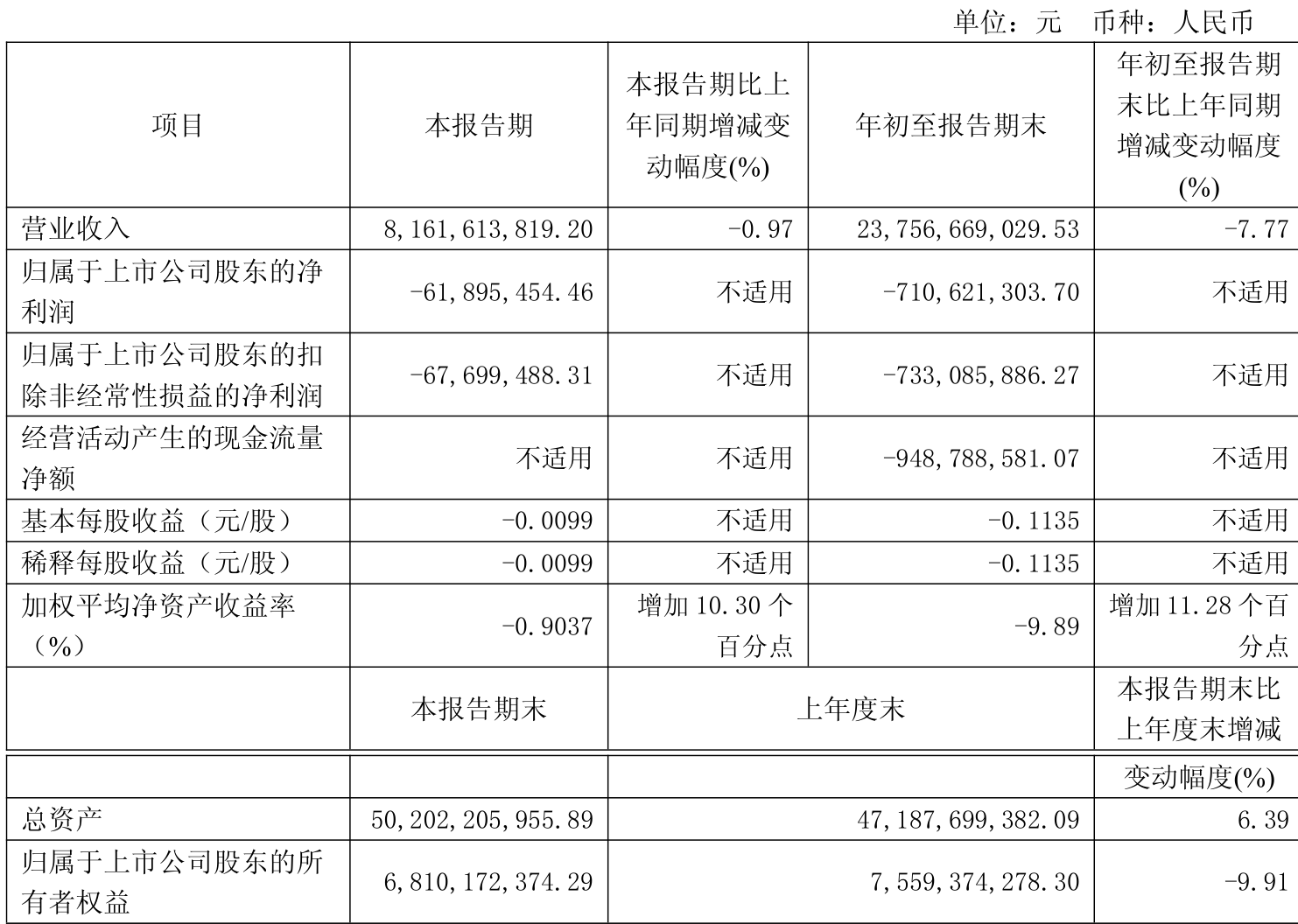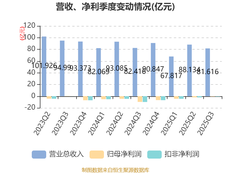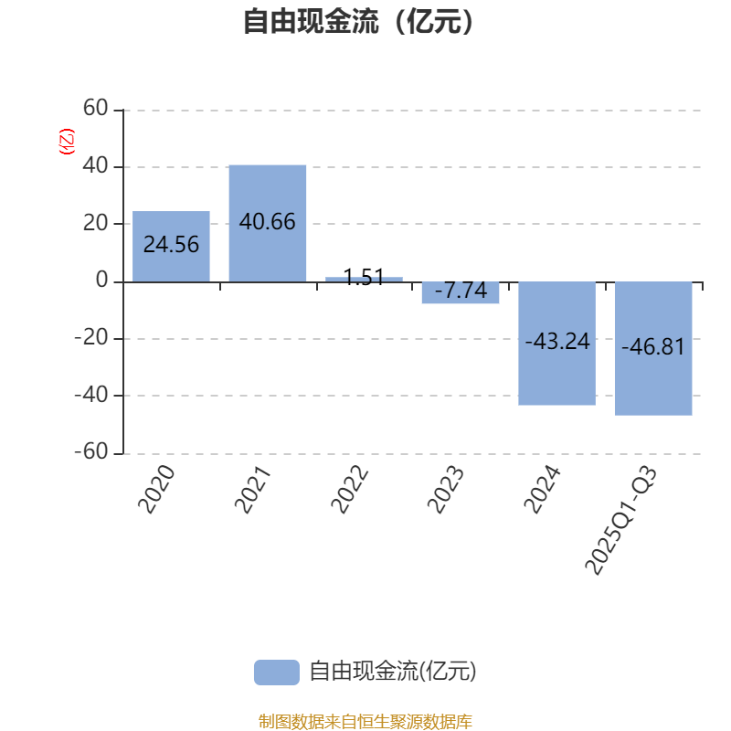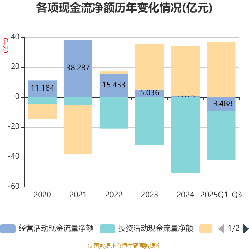 2025年前三季度,公司经营活动现金流净额为-9.49亿元,同比增加5.01亿元;筹资活动现金流净额36.67亿元,同比增加6516.72万元;投资活动现金流净额-32.42亿元,上年同期为-35.5亿元。