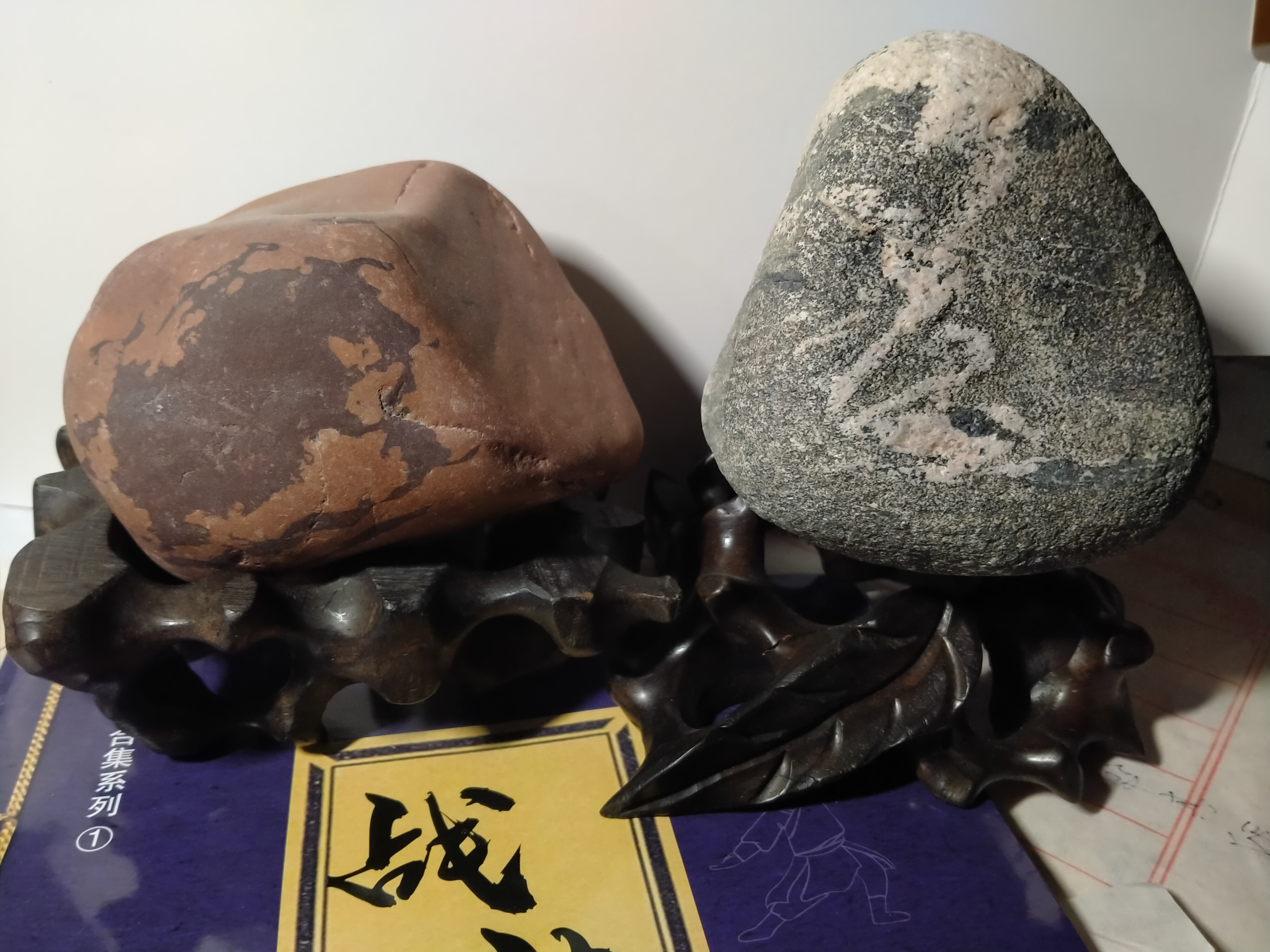 照片左面,奇石天然图案为牛与鼠握手,寓意为"数我最牛",照片右面平安石,赫然一个"茶"字,纯天然形成。