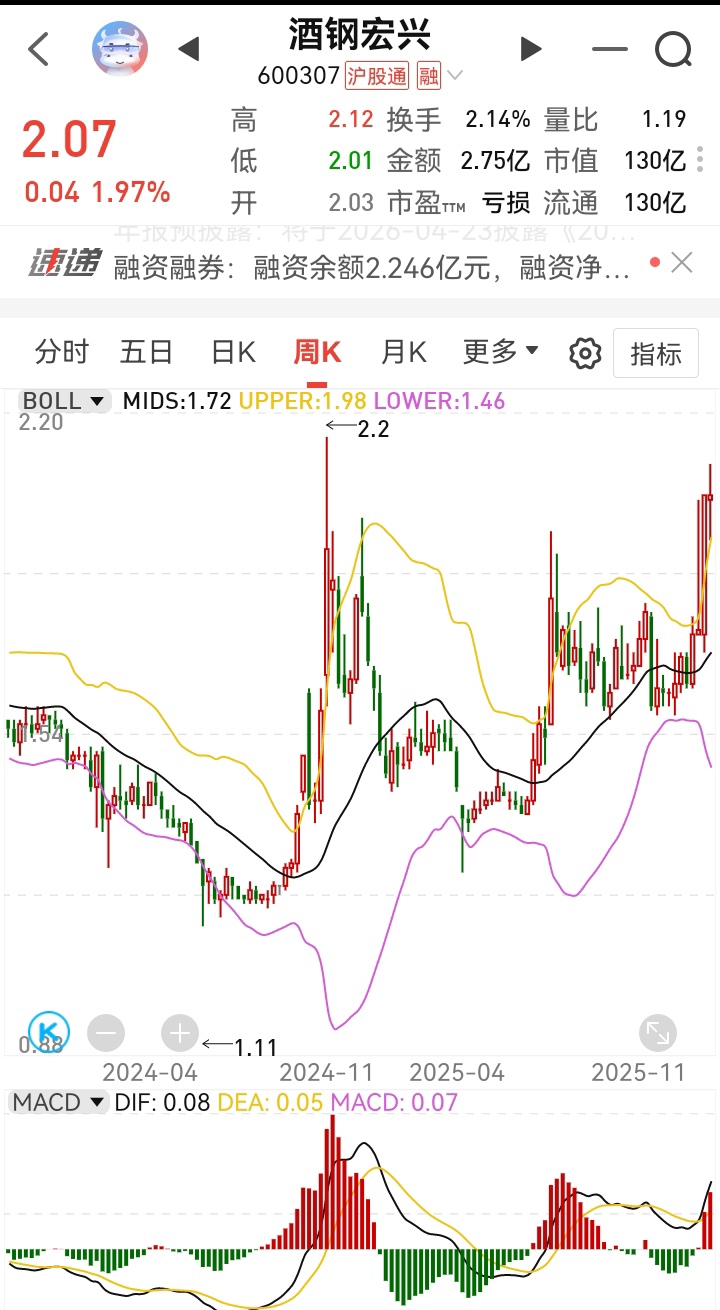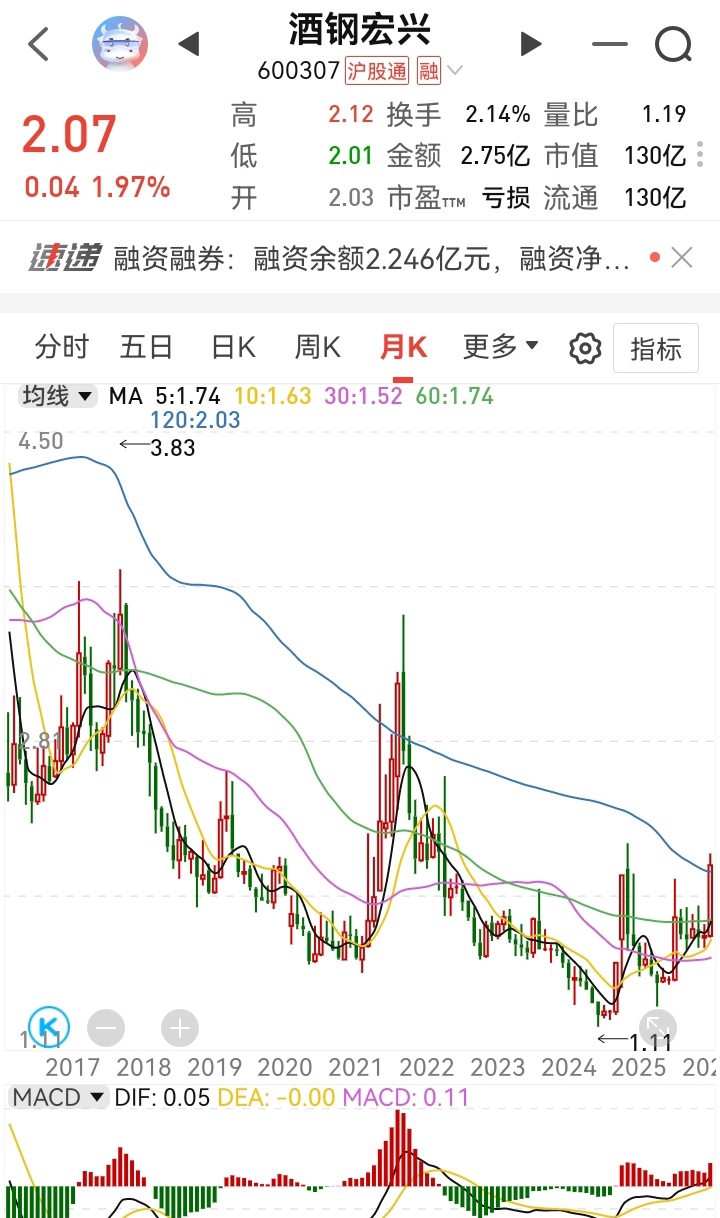 $酒钢宏兴(SH600307)$ 当月线关键点位2.03有效突破,月线M5击穿M120金叉,月线级别的长线牛股确定,翻倍概率狠狠狠大,短线周线刷新前高2.2,节前套利资金出逃,可能会在2.0一线磨合做底