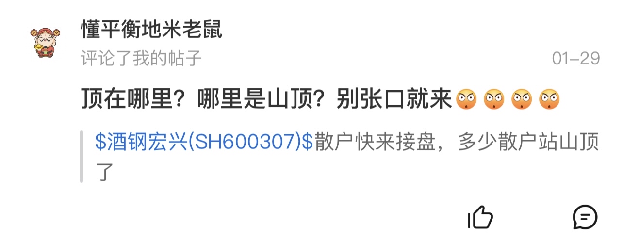 $酒钢宏兴(SH600307)$ 前段时间就让你们走了,现在挂山上了,还问山顶在那,真是鼠目寸光
