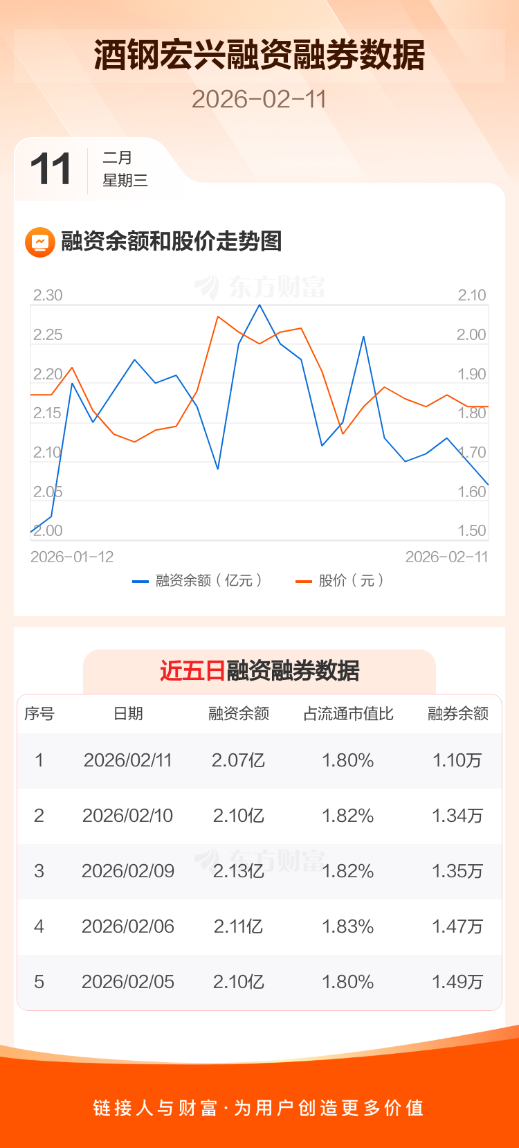 交易所最新数据显示,酒钢宏兴于2026年2月11日获融资买入777.27万元,融资偿还1041.57万元,当日融资净偿还264.3万元。目前,该股融资余额2.07亿,占流通市值比例为1.80%。