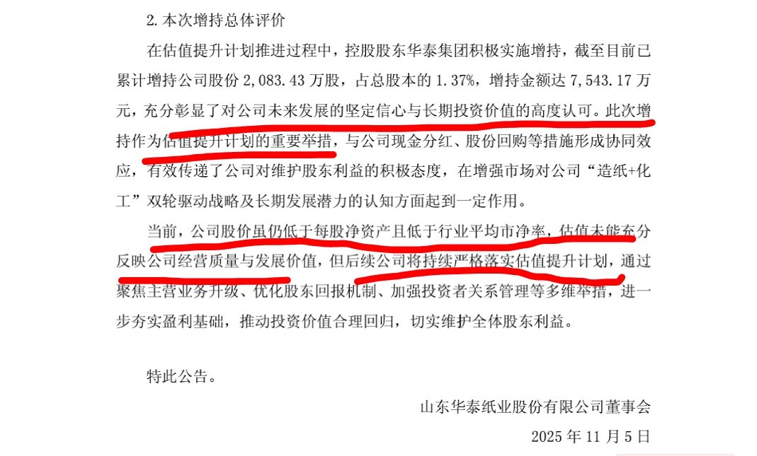 华泰股份应该有危机感了,股价长期大幅破净,市值管理失败,估值提升计划今年就没有任何具体措施和行动,唯一的大股东增持还是一年多以前的措施,这一年多公司光是公告个估值提升计划就不了了之了,上边会不会找去谈话?另外公司公告强调目前股价没有体现出公司价值,那就更应该有行动了