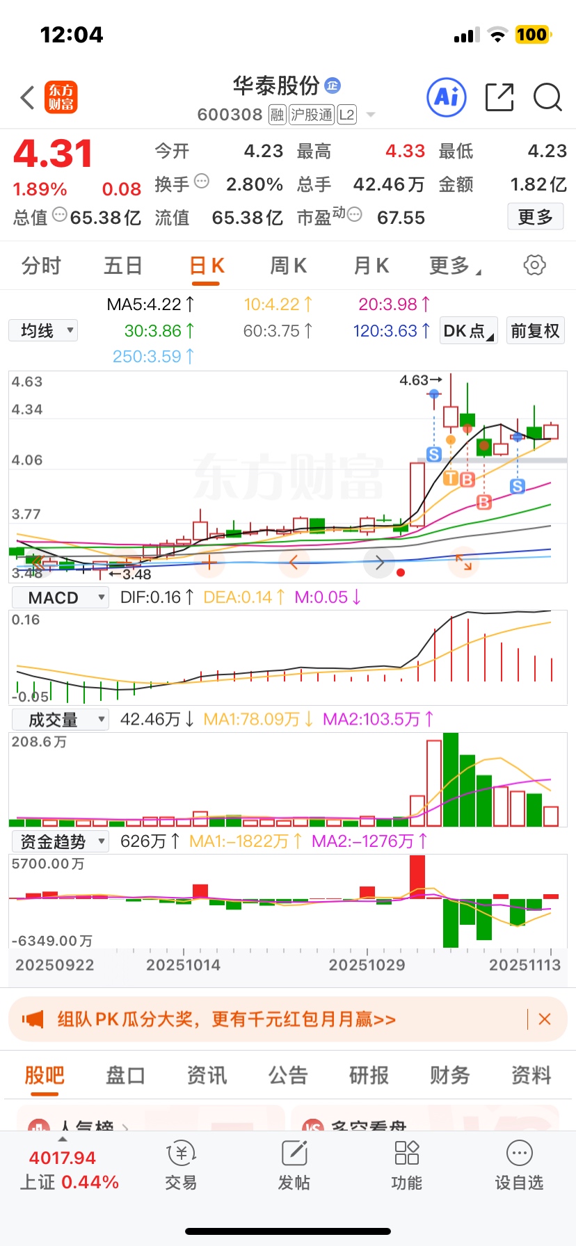 $华泰股份(SH600308)$ 我已卖飞,主力可以拉了,守了6年了,昨天挂4.14没成交,大腿都拍肿了