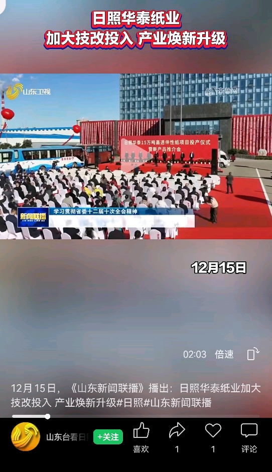 目前,华泰已在日照连续实施了七个特种浆纸一体化技改项目,累计投资超20亿元。企业特种浆纸年总产量突破60万吨,销售收入超40亿元,产品远销全球80多个国家和地区