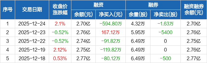 华泰股份:融资净偿还594.8万元,融资余额2.7亿元(12-24)