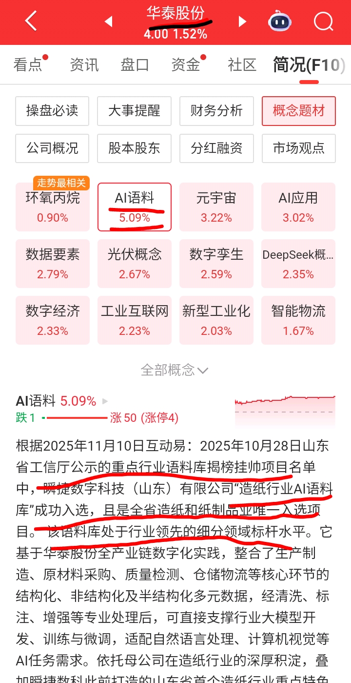 华泰股份尾盘万手算什么,华泰股价已经远远落后概念涨幅太多太多了,那个连施舍都不算,是实在压不下去了,看看AI语料概念指数大涨了多少吧!华泰股份是被认定的正宗AI语料概念股