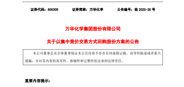 万华化学表示,为维护公司全体股东利益,增强投资者信心,稳定及提升公司价值,基于对公司未来发展的信心,公司董事长廖增太先生提议公司通过集中竞价交易方式回购部分公司股份,回购的股份将用于减少注册资本,优化公司资本结构,提升公司股东价值。