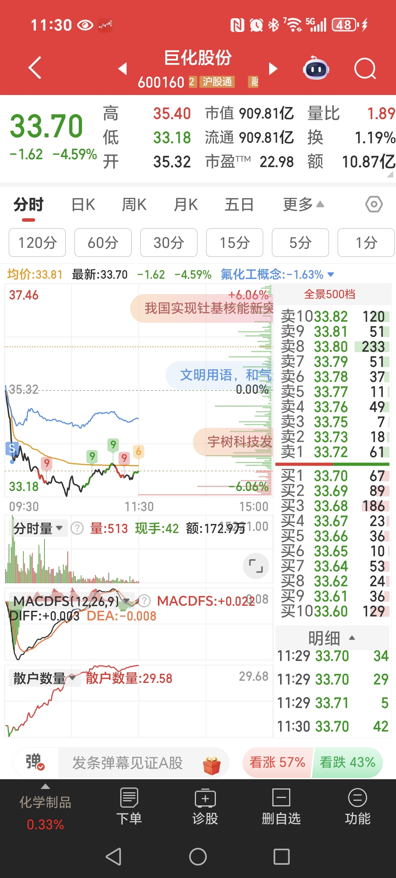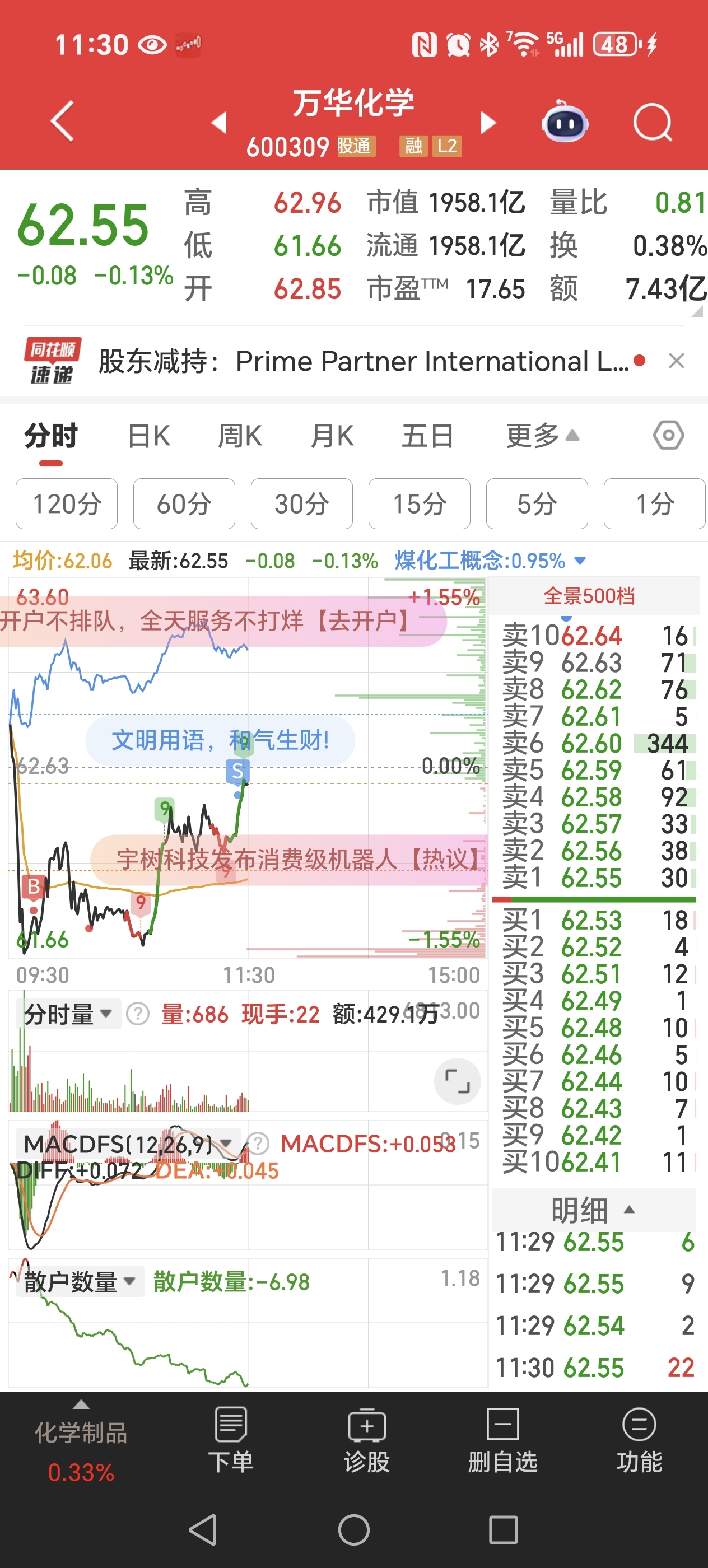 早盘止损巨化股份,补仓万华化学,建仓浙数文化,王府井和汾酒仓位没动