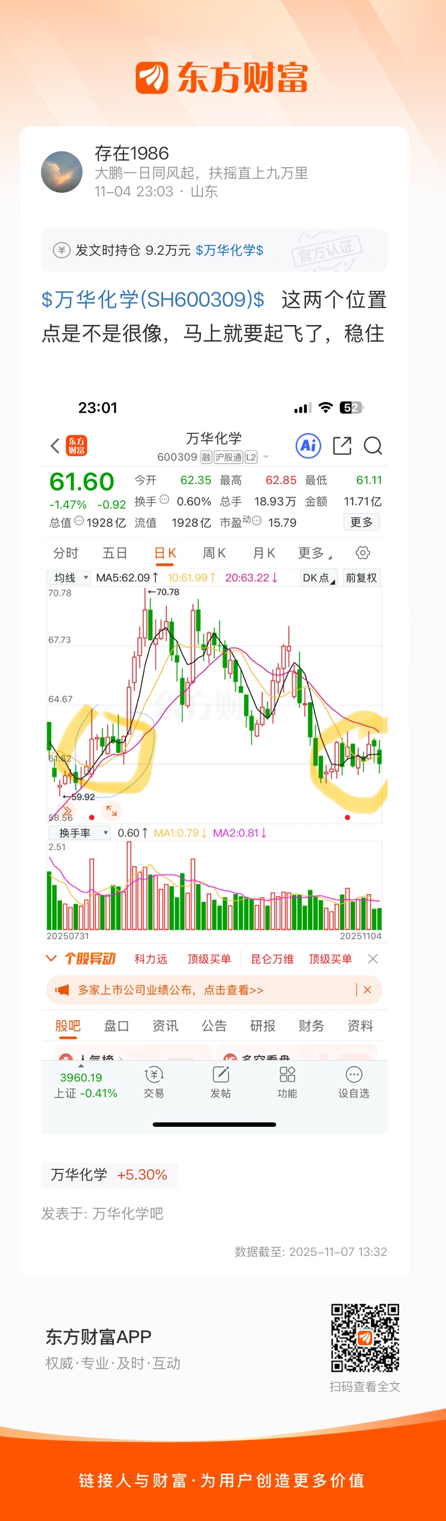$万华化学(SH600309)$ 我前几天就说要起飞,我这玄学算法还行哈