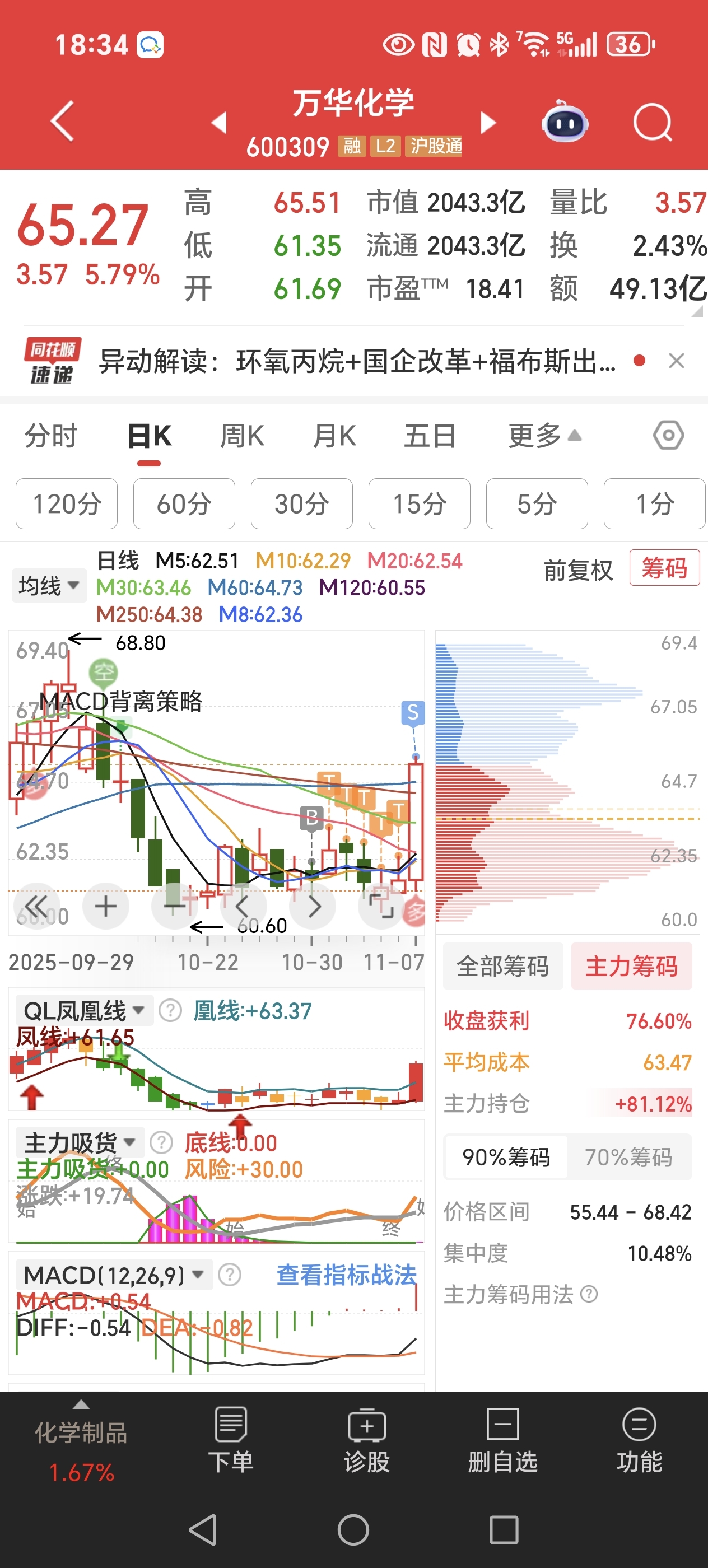 $万华化学(SH600309)$ 今天一阳穿n线,高点减了一半仓位。关于今天的公告没必要过分解读,主力肯定比我们小散先知先觉,今天多了几十亿的量,我们这三瓜两枣怕什么