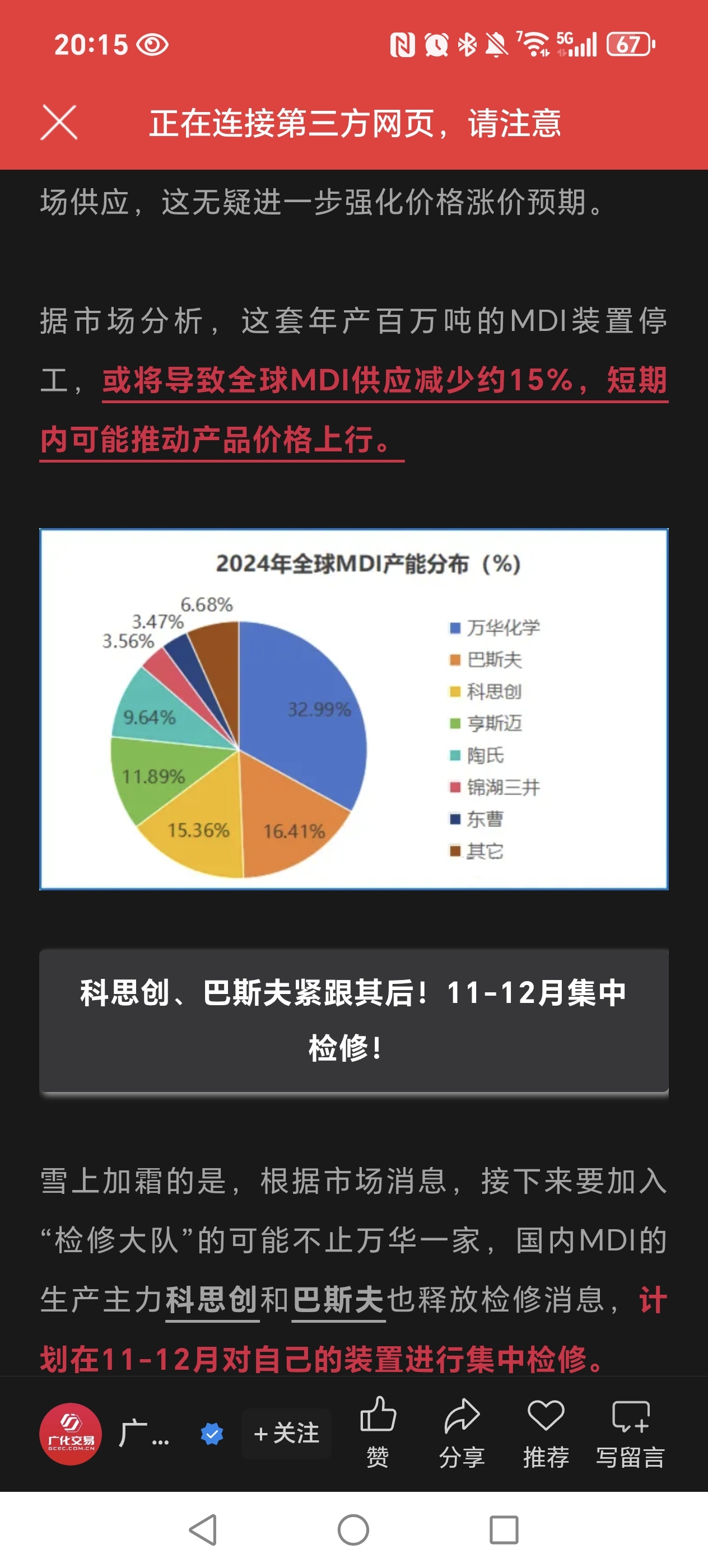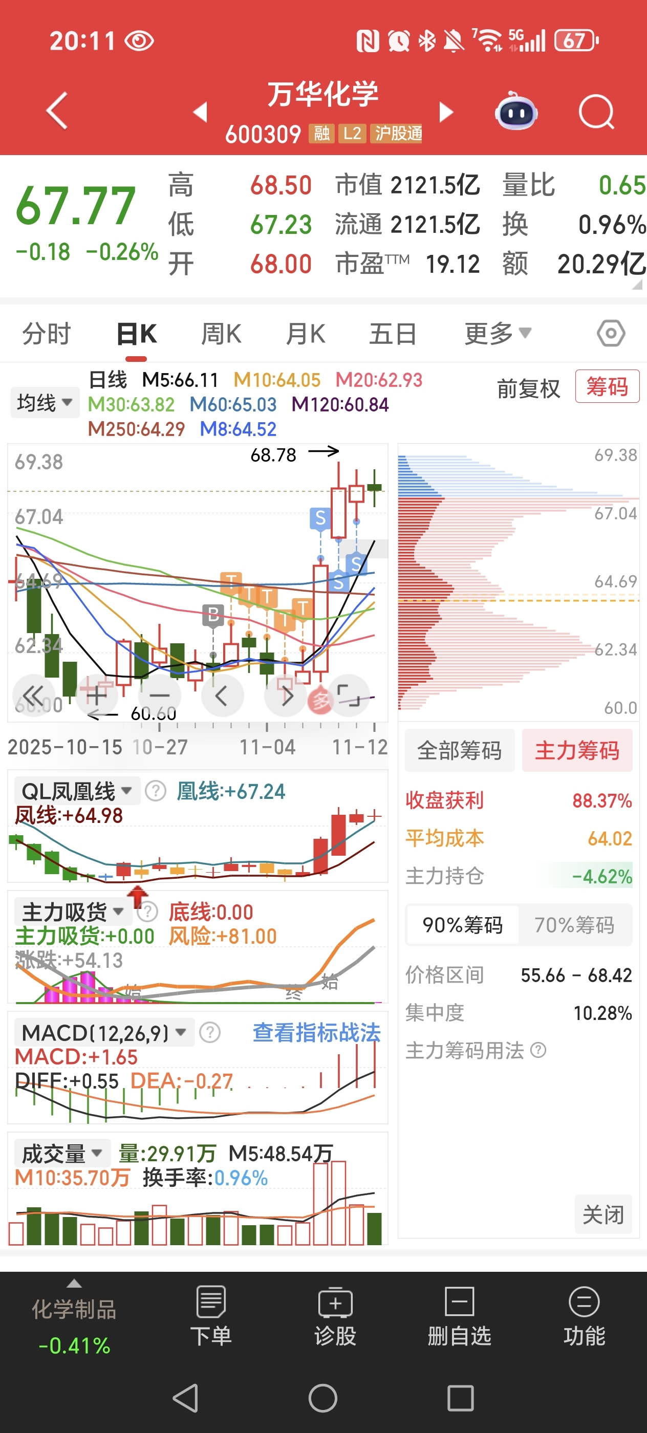 $万华化学(SH600309)$ 其实一直在等它回调5日线或者补缺口等着买回来,三天缺口都没补视为强,这两天都是68以上减的仓,明天有好的位置说什么也接回来点先。盘后又有消息世界另外两大巨头企业mdi停产检修,mdi涨价逻辑值得思考。股价也在相对底部。