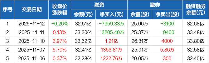 万华化学:融资净偿还7959.33万元,融资余额32.51亿元(11-12)