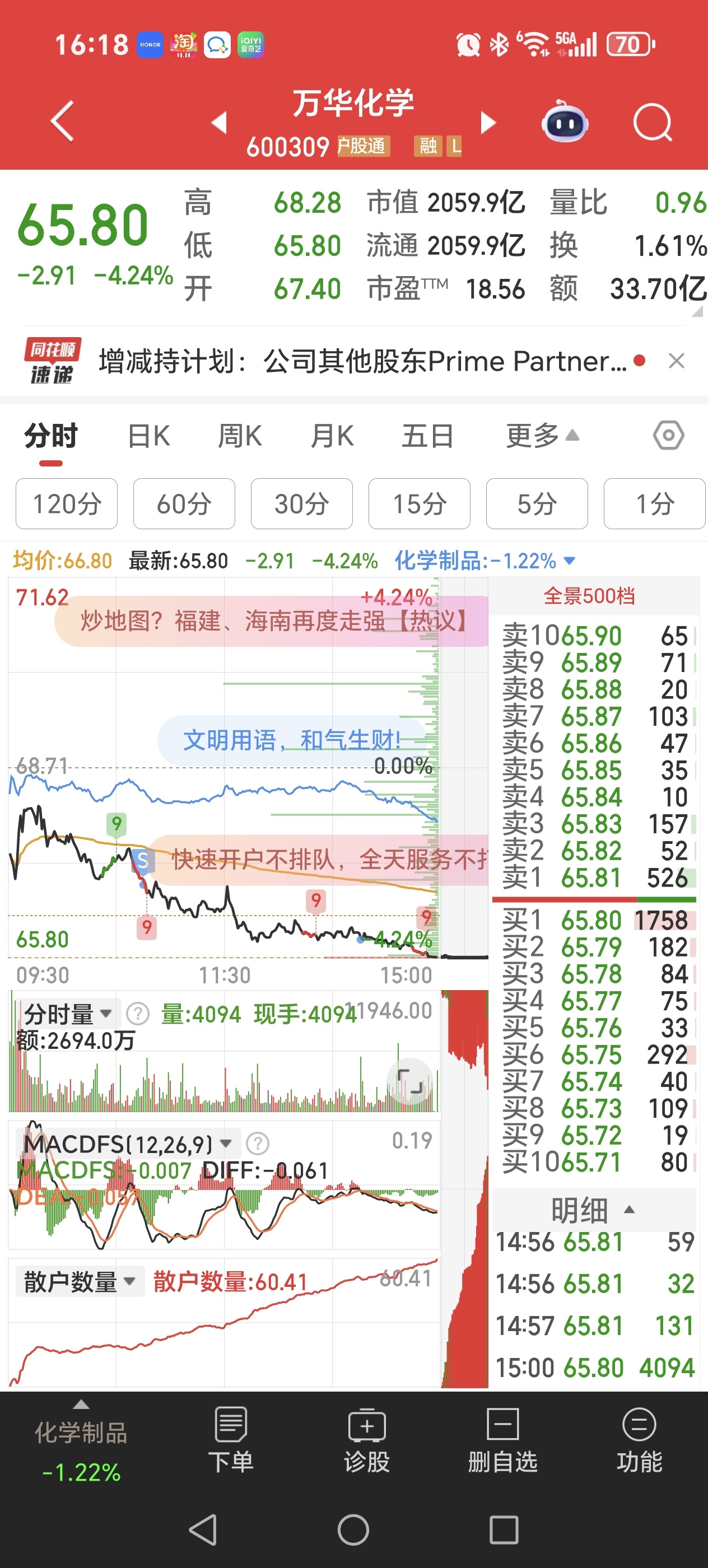 $万华化学(SH600309)$ 今天67先获利了结,受减持影响后几天可能都不会立马起来,等20日线下周上来吧,正好也把缺口补了,64附近再看