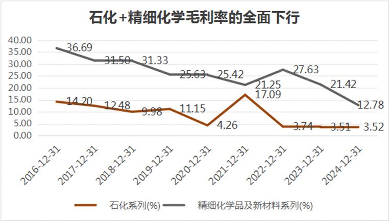 石化业务连续交出多年不到5%的毛利表现;而被内部寄予厚望的精细化工,同样也被连续多年全国产能扩充压得喘不过气来。