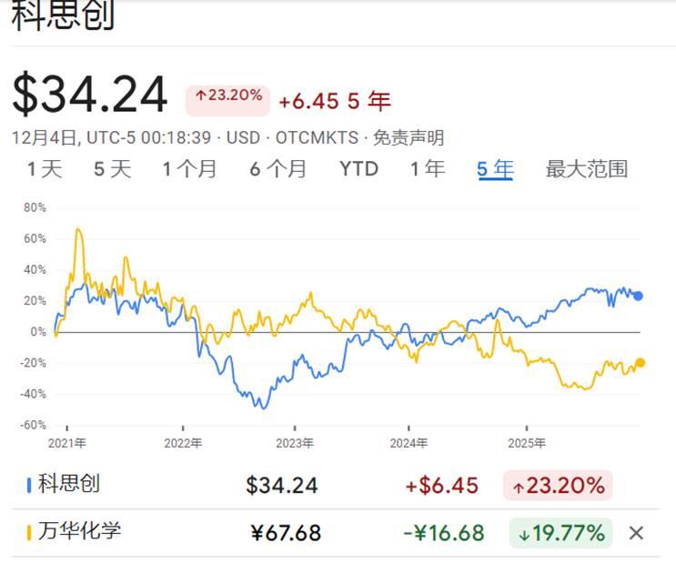 万华化学产能和盈利高歌猛进,与欧洲老牌化工的去产能形成了鲜明的对比;但市值的表现却截然相反,万华股价过去5年跌了19%,而科思创却涨了23%。