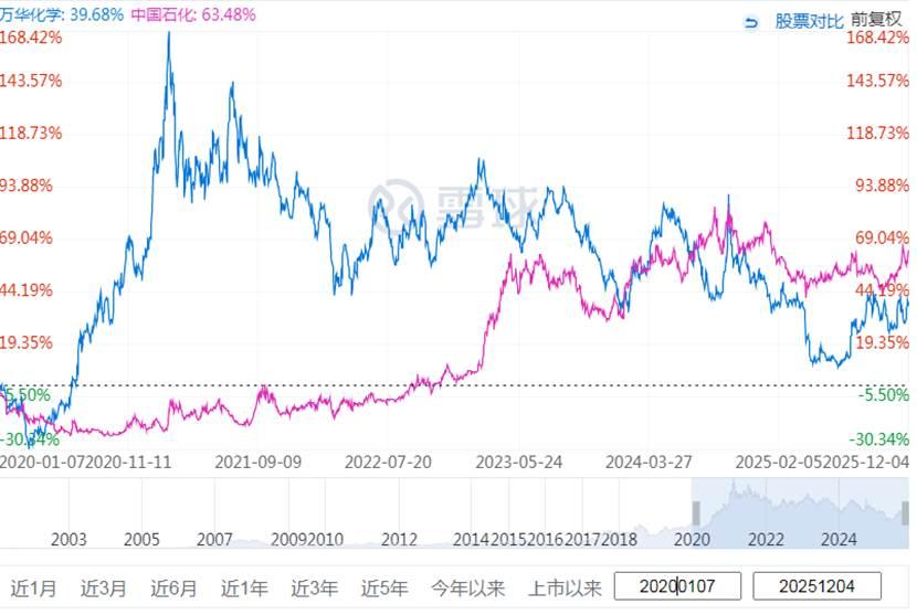 一度市值超过中国石化的万华化学,今天的市值,只有不到中石化的30%。