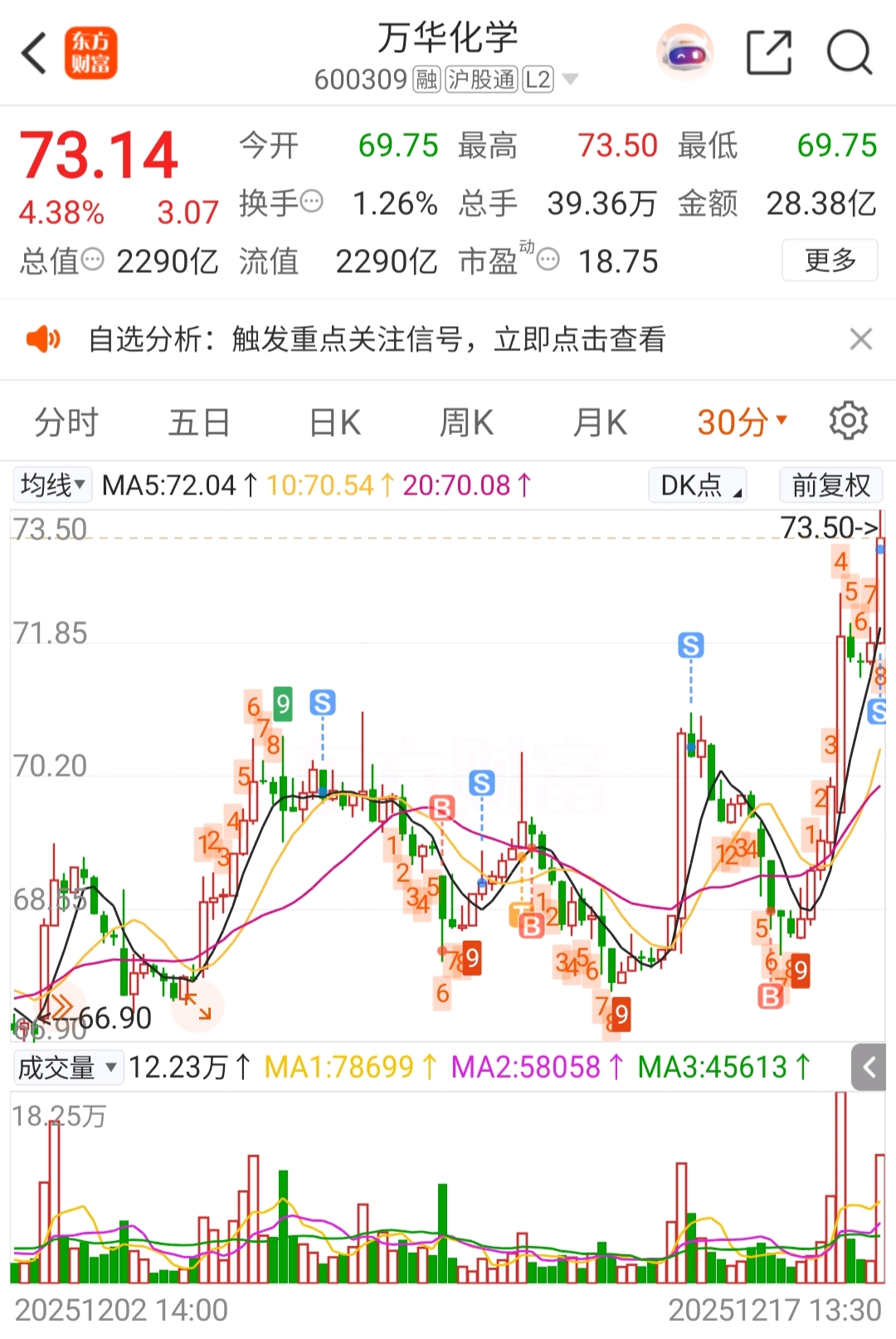 $万华化学(SH600309)$ 这个位置已经触及去年10月份74块钱横盘的那一波阻力位,今天按计划减仓25%,如果跌了再补回,如果涨了就继续拿稳剩下的75%仓位。