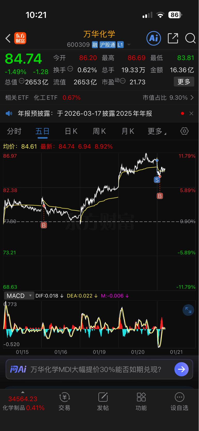 $万华化学(SH600309)$ 昨天清仓今天低吸,希望是正确的选择