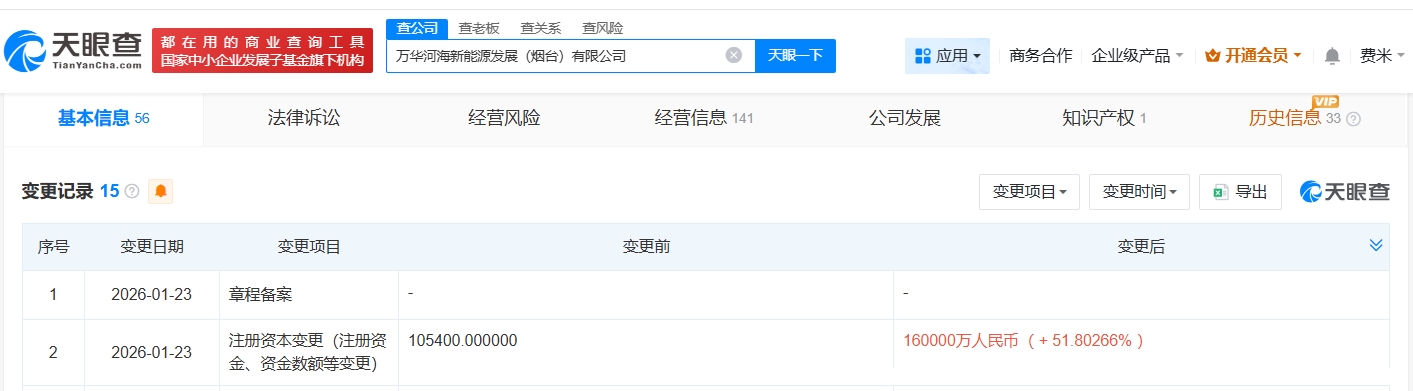 万华化学、河海新能源合资公司增资至16亿 增幅约52%