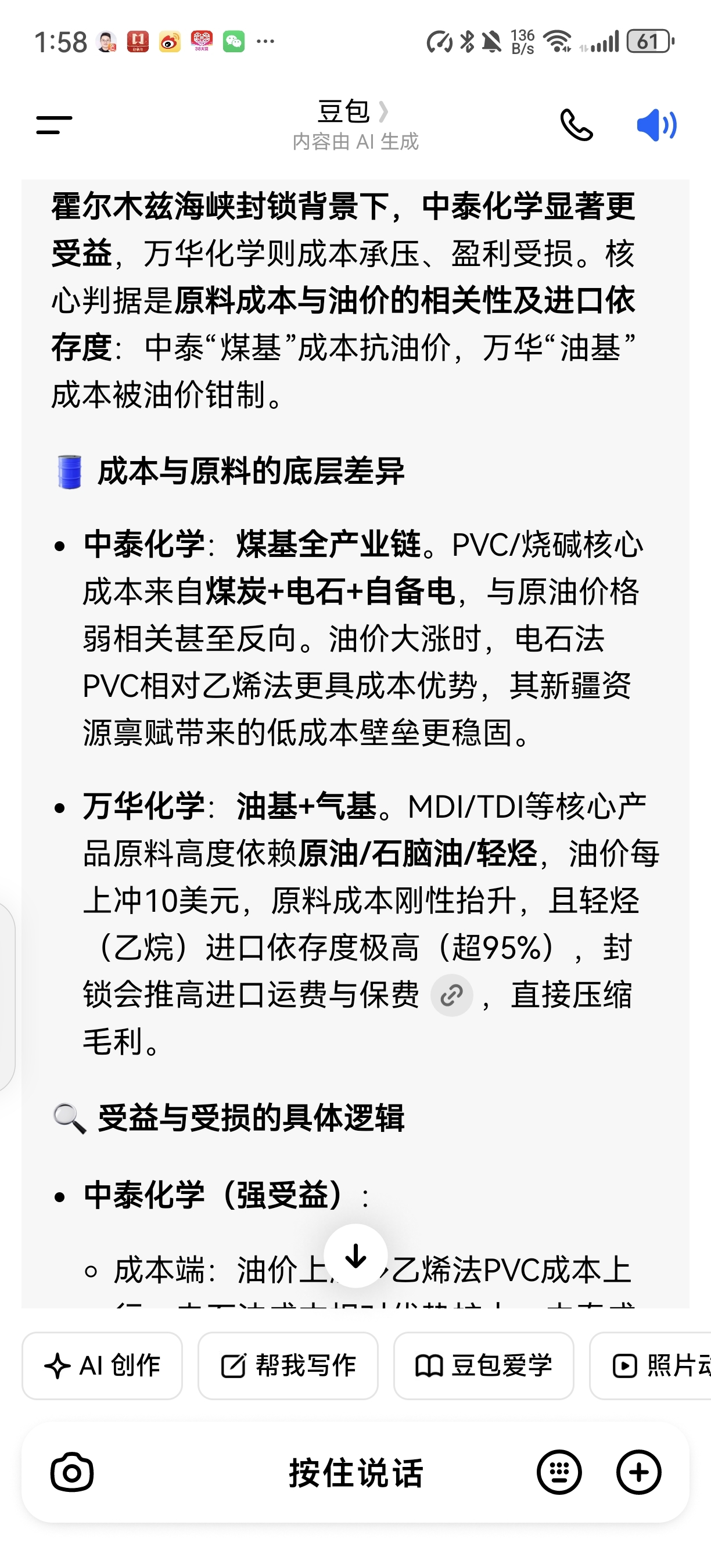 看看豆包怎么分析霍尔姆斯海峡封锁带来的万华化学和同行比