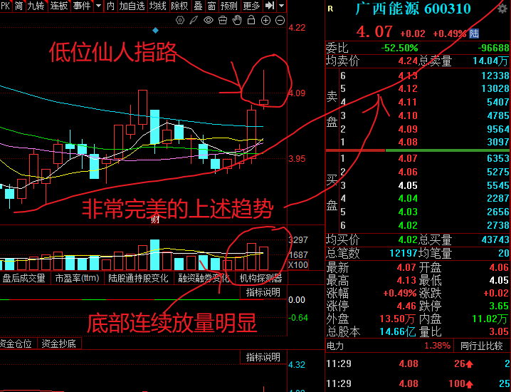 今天上午前半段本可以涨上去的 主力却刻意打压下来 哈哈 主力志存高远啊 这轮上去应该到6块以上了 今天的K线不就是典型的传说中的仙人指路吗 哈哈 底部放量明显 今天的量比已经明显大了 哈哈 我 满仓满融的干了