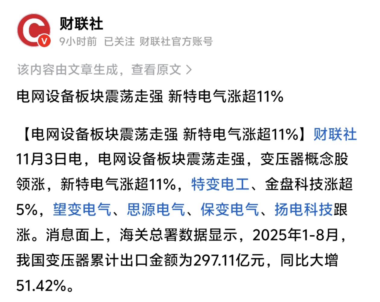 新特电气涨超11%,金盘科技涨超8%,特变电工,广信科技、欣灵电气、西典新能、中国西电、望变电气等跟涨