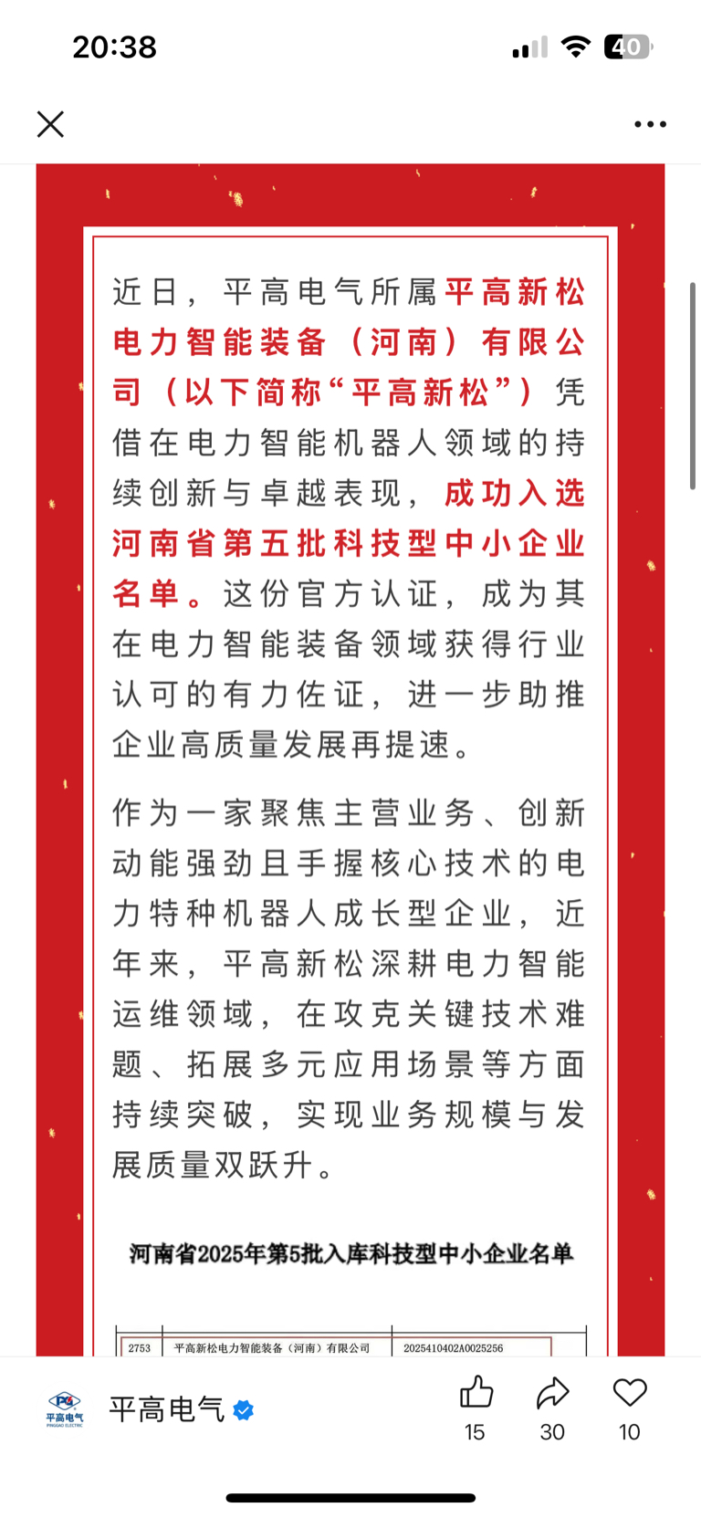 平高新松机器人成功入选河南省2025年第五批科技型中小企业
