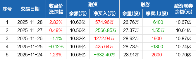 融资方面,当日融资买入4589.26万元,融资偿还4014.3万元,融资净买入574.96万元。融券方面,融券卖出1600股,融券偿还7700股,融券余量26.76万股,融券余额449.3万元。融资融券余额合计10.67亿元。