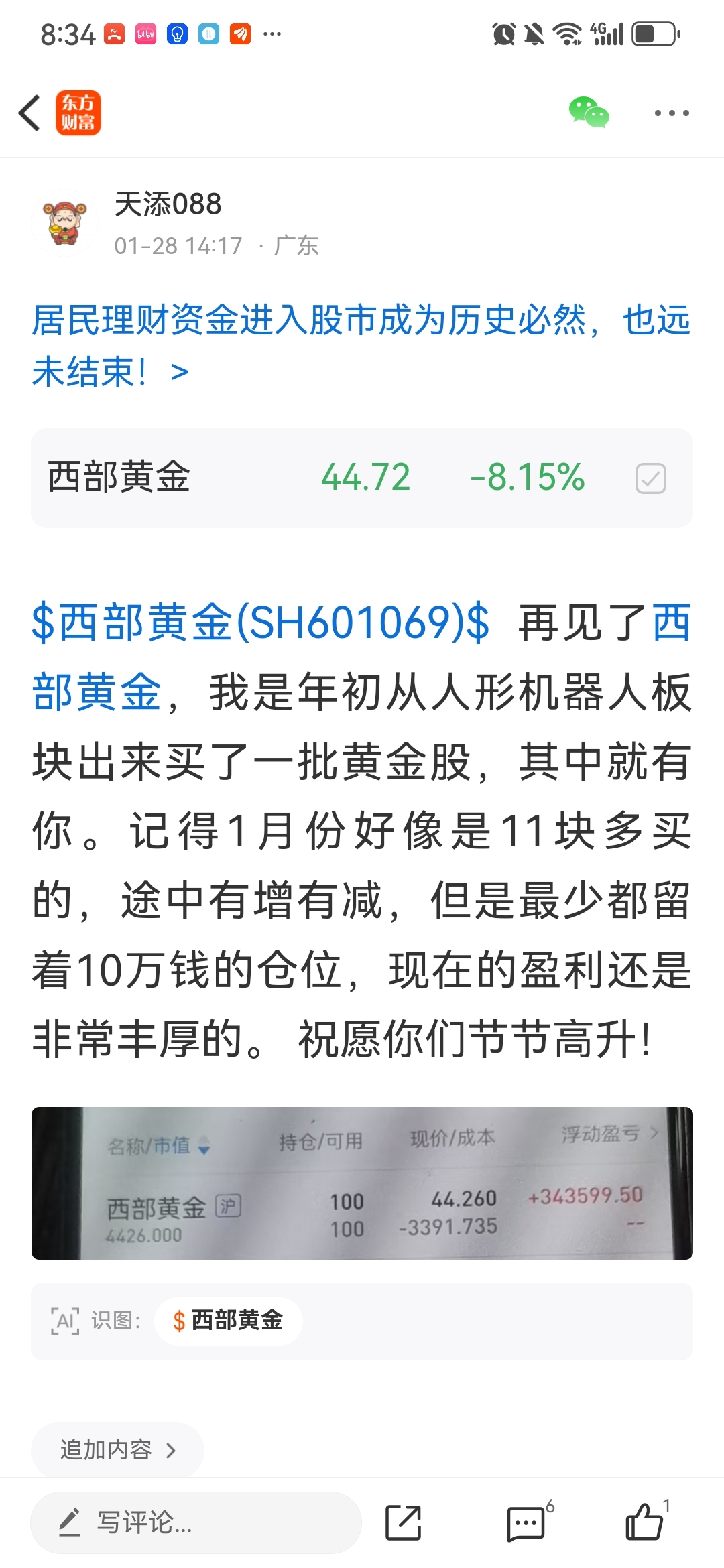 1月28礼拜三开始卖出手中的黄金股,1月30号礼拜五卖出手中最后一只黄金股湖南黄