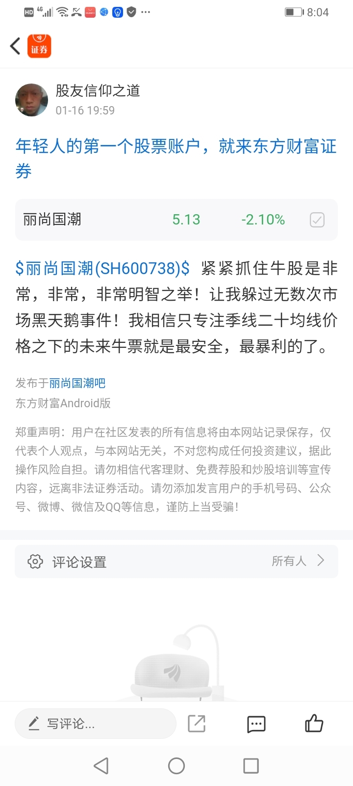 温馨提示: 1.根据《证券法》规定,禁止编造、传播虚假信息或者误导性信息,扰乱证券市场;2.用户在本社区发表的所有资料、言论等仅代表个人观点,与本网站立场无关,不对您构成任何投资建议。用户应基于自己的独立判断,自行决定证券投资并承担相应风险。《东方财富社区管理规定》
