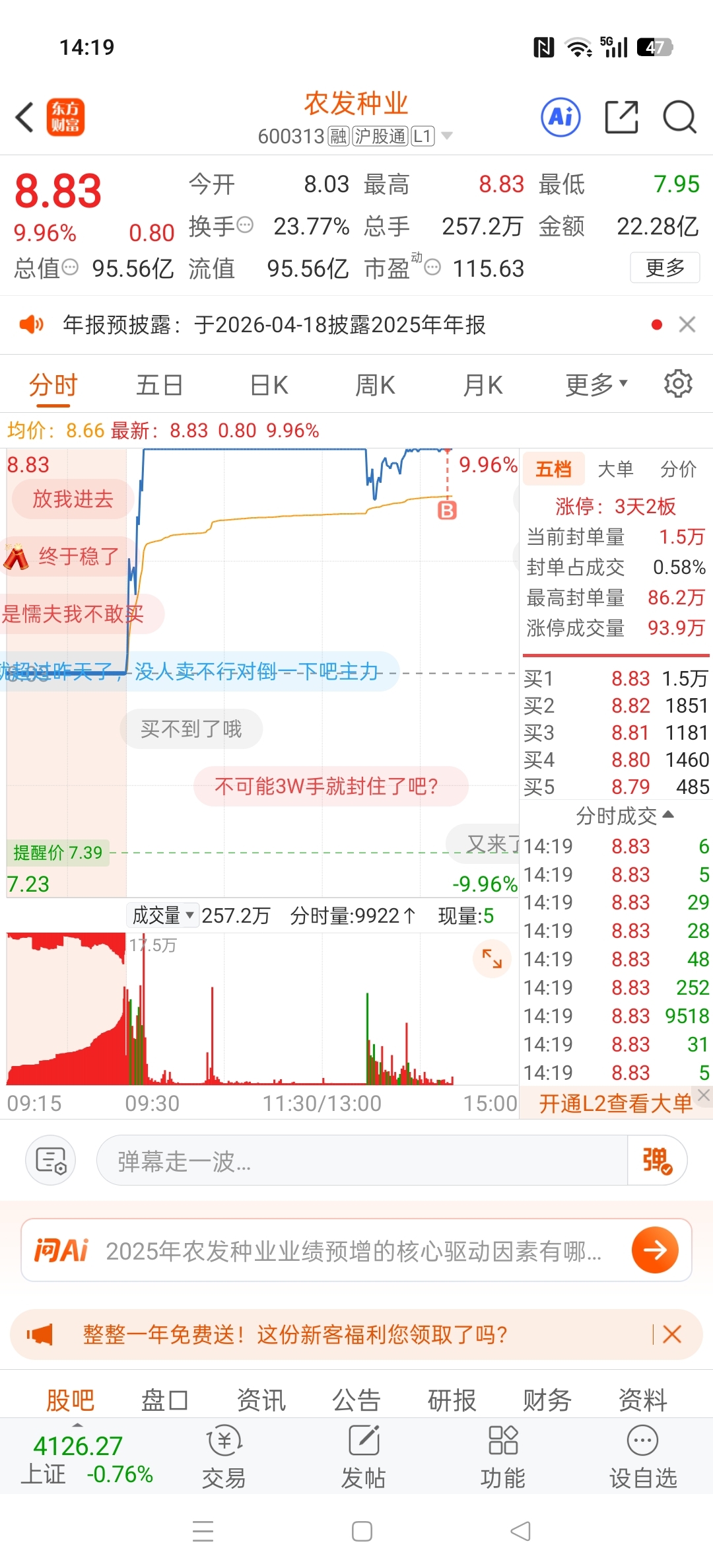 $农发种业(SH600313)$ 合力放量可以打板了