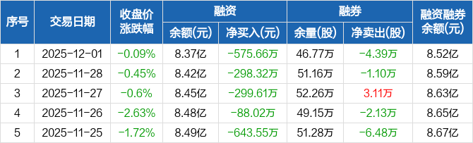 融资方面,当日融资买入1539.9万元,融资偿还2115.56万元,融资净偿还575.66万元,连续5日净偿还累计1905.16万元。融券方面,融券卖出1.81万股,融券偿还6.2万股,融券余量46.77万股,融券余额1540.16万元。融资融券余额合计8.52亿元。