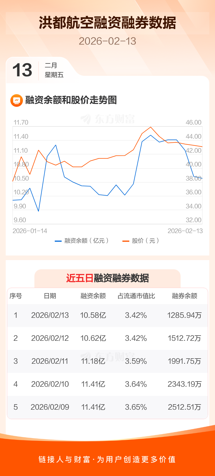 交易所最新数据显示,洪都航空于2026年2月13日获融资买入3478.57万元,融资偿还3933.95万元,当日融资净偿还455.38万元。目前,该股融资余额10.58亿,占流通市值比例为3.42%。