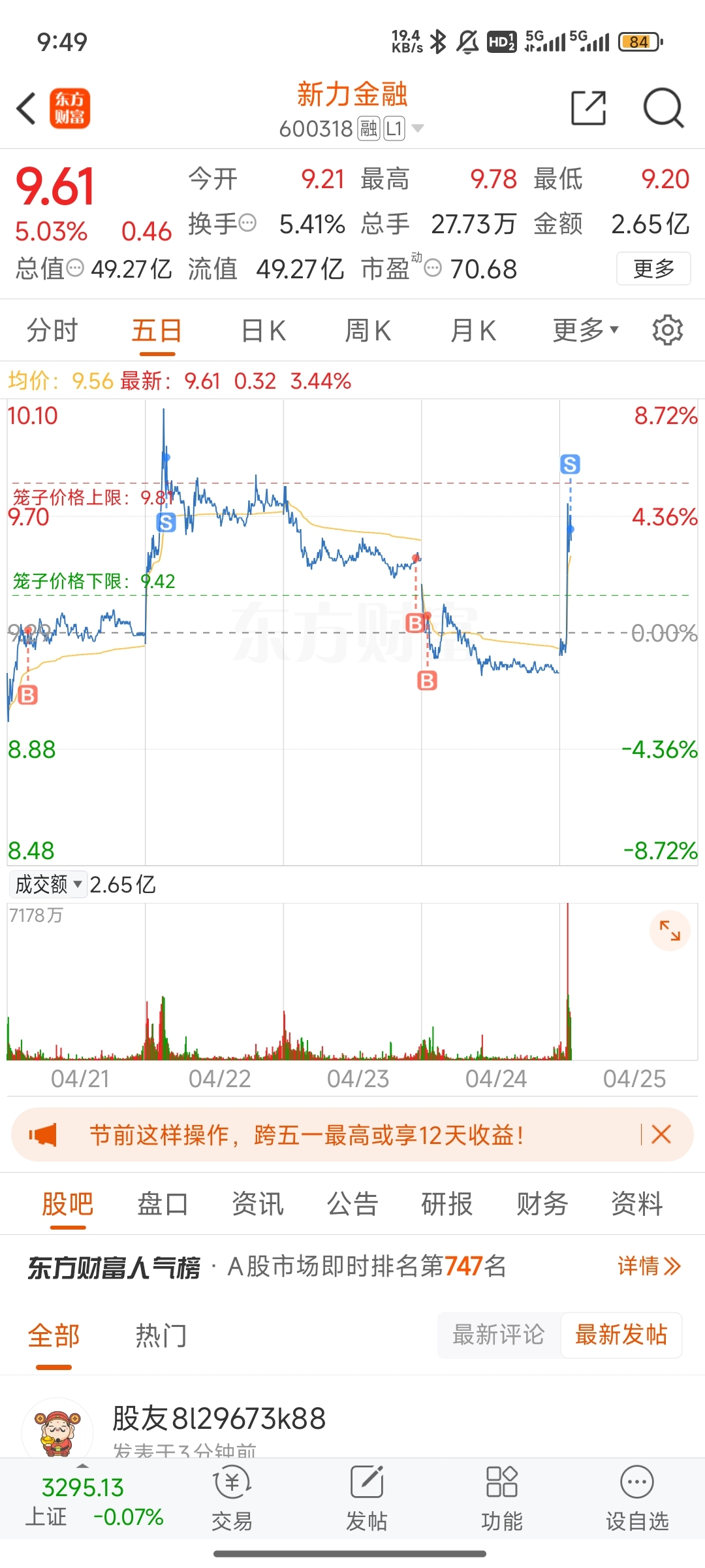 $新力金融(SH600318)$ 先溜啦,尾盘再看看没有机会了。