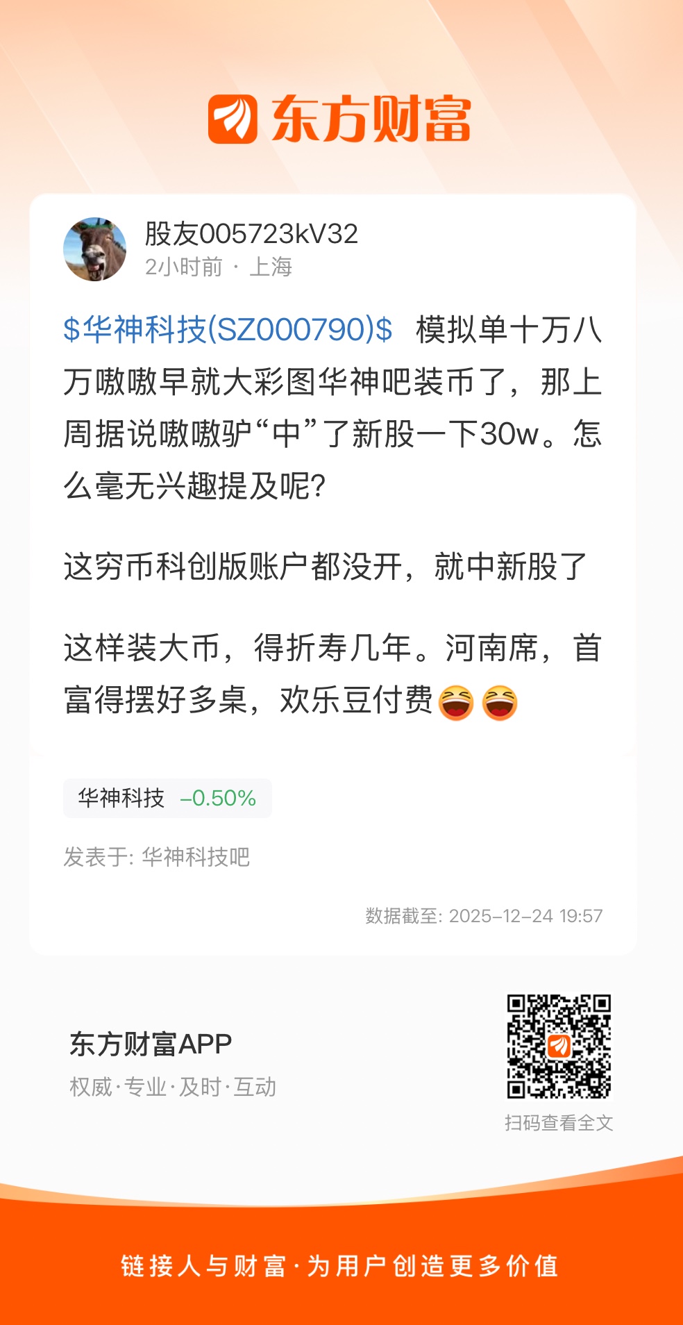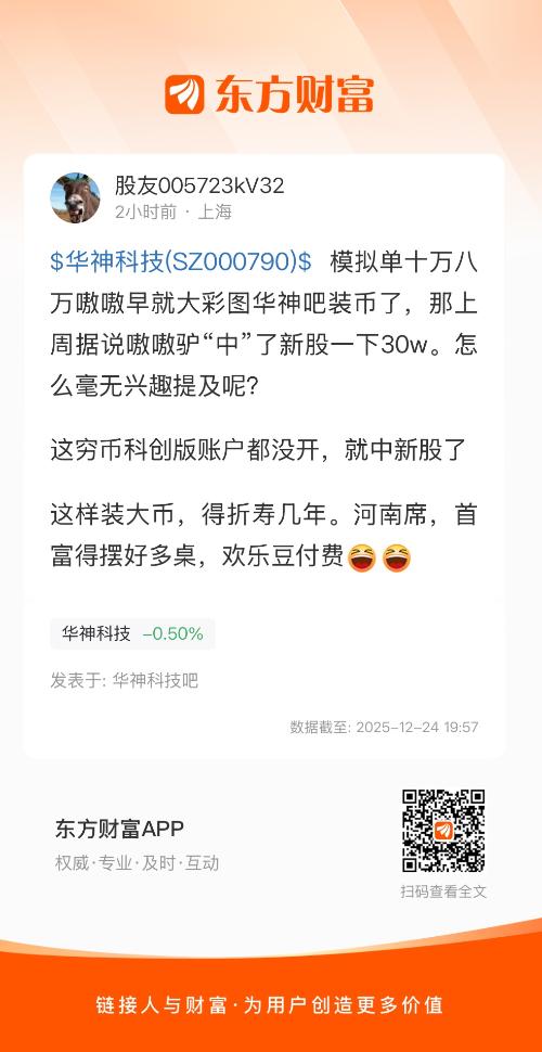 $华神科技(SZ000790)$ 模拟单十万八万嗷嗷早就大彩图华神吧装币了,那上周据说嗷嗷驴“中”了新股一下30w。怎么毫无兴趣提及呢?