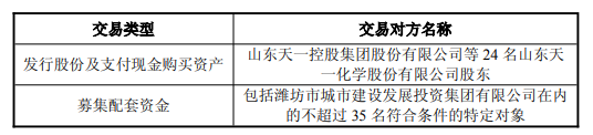 交易预案显示,公司拟通过发行股份及支付现金的方式购买天一控股等24名股东持有的天一化学100%股权。同时,公司拟向包括潍坊市城投集团在内的不超过35名符合条件的特定投资者发行股份募集配套资金。
