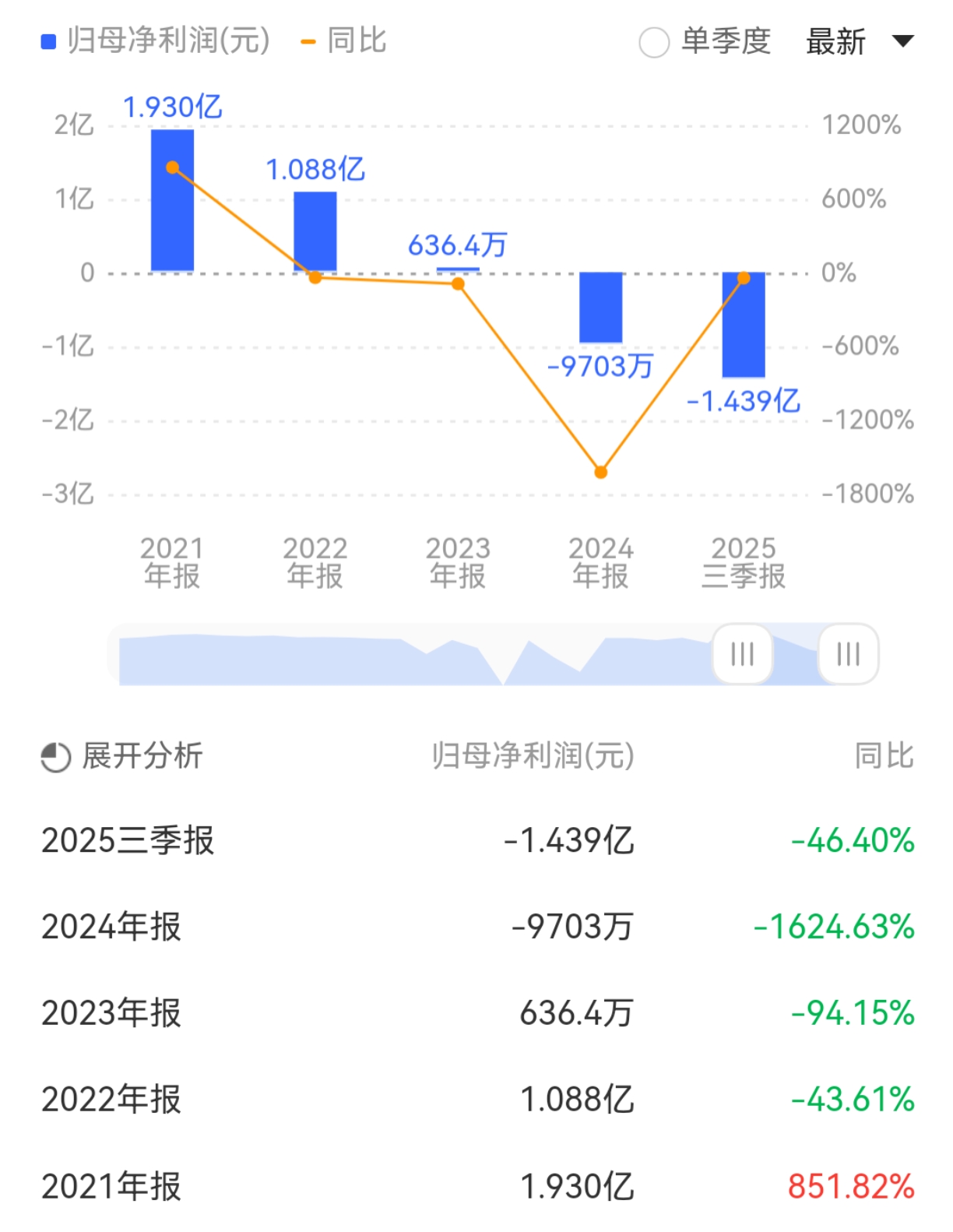 2025年前三季度,公司实现营业总收入6.41亿元,同比下降2.53%;归母净利润亏损1.44亿元,上年同期亏损9830.81万元;扣非净利润亏损1.44亿元,上年同期亏损1.06亿元。