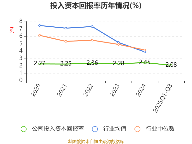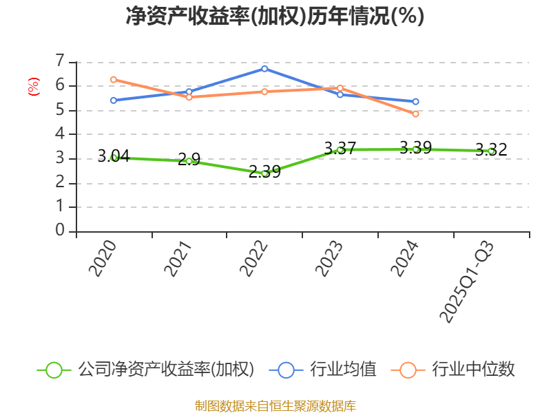盈利能力方面, 2025年前三季度公司加权平均净资产收益率为3.32%,同比上升0.56个百分点。公司2025年前三季度投入资本回报率为2.08%,较上年同期上升0.08个百分点。