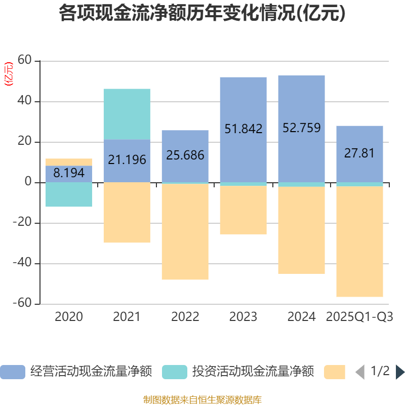 2025年前三季度,公司经营活动现金流净额为27.81亿元,同比增长34.82%;筹资活动现金流净额-54.54亿元,同比减少28.14亿元;投资活动现金流净额-2.07亿元,上年同期为-7.27亿元。